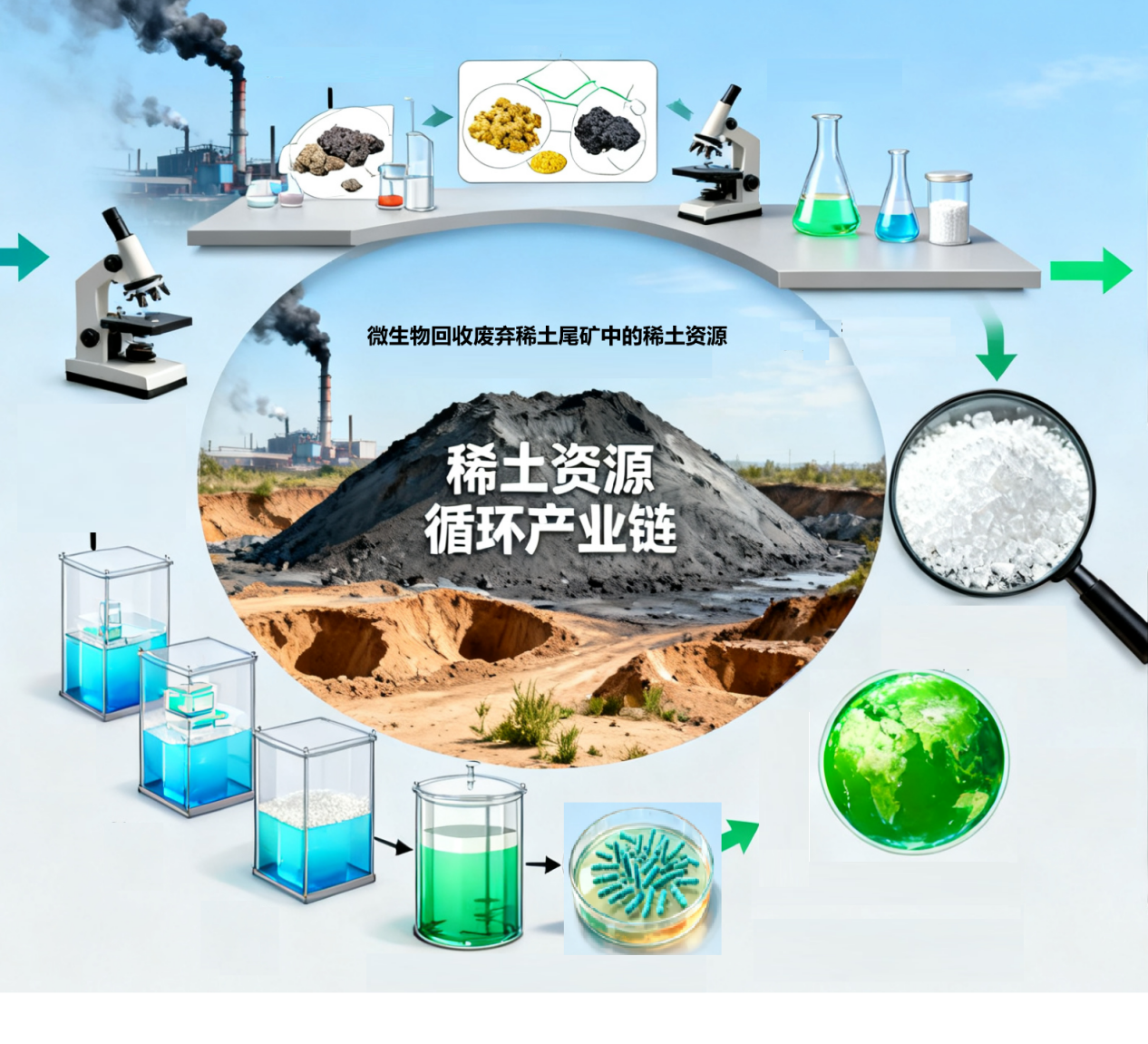 1. 机理研究: 通过实验探究微生物浸出废弃稀土尾矿矿渣中稀土元素的效率,并表征分析微生物-矿物界面作用机制,为工艺设计提供理论指导。