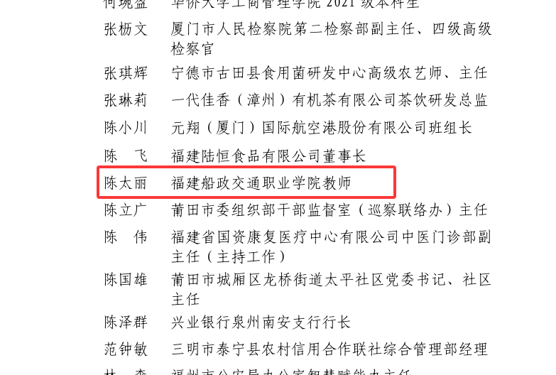近日,共青团福建省委公示2025年度福建青年五四奖章、福建新时代青年先锋、福建省五四红旗团委(团支部)、福建省优秀共青团员、福建省优秀共青团干部表彰对象。我院教师陈太丽获评“2025年度福建省新时代青年先锋”荣誉称号,特此祝贺!