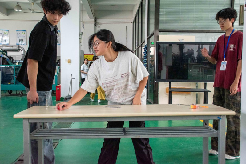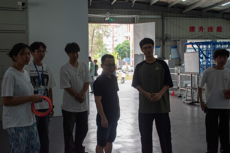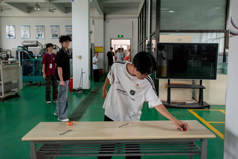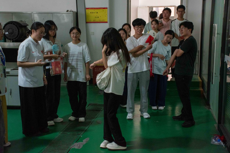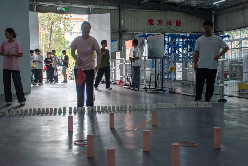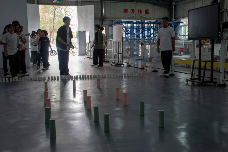 26号楼智能工程实训基地前,“找到真正的自己”挑战现场人头攒动。“大象鼻子转 5 圈”——随着口令响起,学子们手扶立柱,在旋转中稳住重心;眩晕感未消,便迅速冲向机械零件摆放区,争分夺秒完成任务。40秒的限时角逐里,有人踉跄却不放弃,有人敏捷又从容,紧张的氛围中满是青春的果敢。成功通关者接过“暖心寄语”,脸上的笑容里藏着突破自我的骄傲。这个看似简单的游戏,让学子们在旋转中解锁潜藏的平衡力与专注力,每一圈转动都是与自我的对话,每一次成功都是成长的勋章。