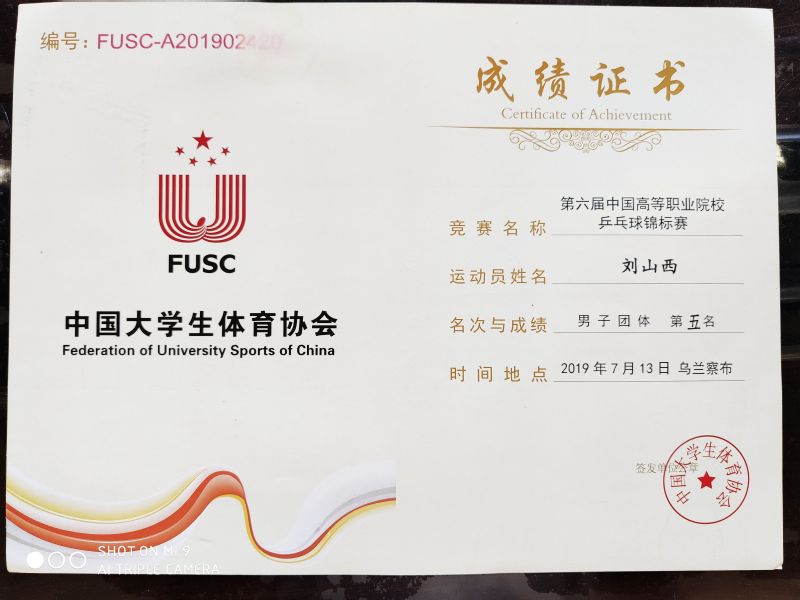 2019年7月10日至13日,我系2018级汽车营销与服务1班学生姚华骅、2017级汽车运用与维修技术1班刘山西等同学,在内蒙古乌兰察布职业学院举行的第六届中国高职院校乒乓球锦标赛中,通过与全国33所院校近180名运动员的激烈角逐,最终获得全国男子团体第五名的历史最好成绩。