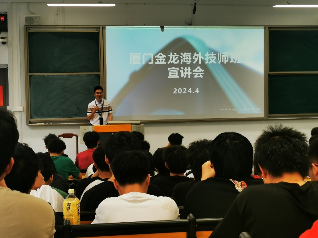 为更好服务“一带一路”,深化产教融合,加强校企交流合作,强化人才建设,2024年4月17日,汽车学院联合厦门金龙联合汽车工业有限公司(以下简称“金龙”)开展海外技师订单班宣讲和选拔,这是双方共建沙特“海丝学院”后的进一步合作。汽车学院苏庆列院长、厦门金龙人事部及海外售后服务部经理、相关专业教师及2023级汽车智能技术专业全体学生参加了活动。
