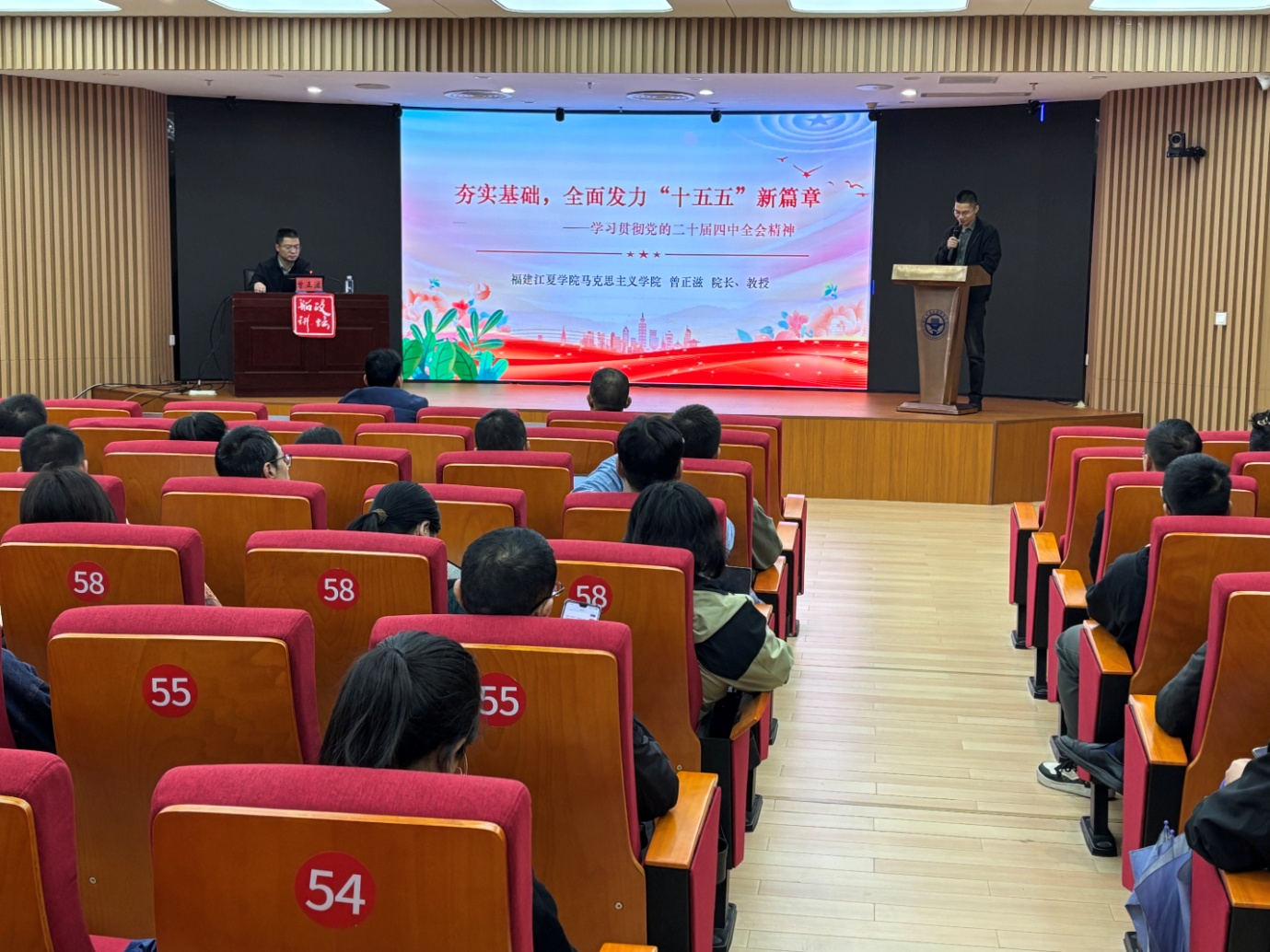 为深入学习贯彻习近平总书记在党的二十届四中全会上的重要讲话精神和《中共中央关于制定国民经济和社会发展第十五个五年规划的建议》,深刻认识全会的重大意义, 11月12日下午,特邀福建江夏学院马克思主义学院院长曾正滋教授以夯实基础,全面发力“十五五”新篇章为主题的学习贯彻党的二十届四中全会精神专题讲座。