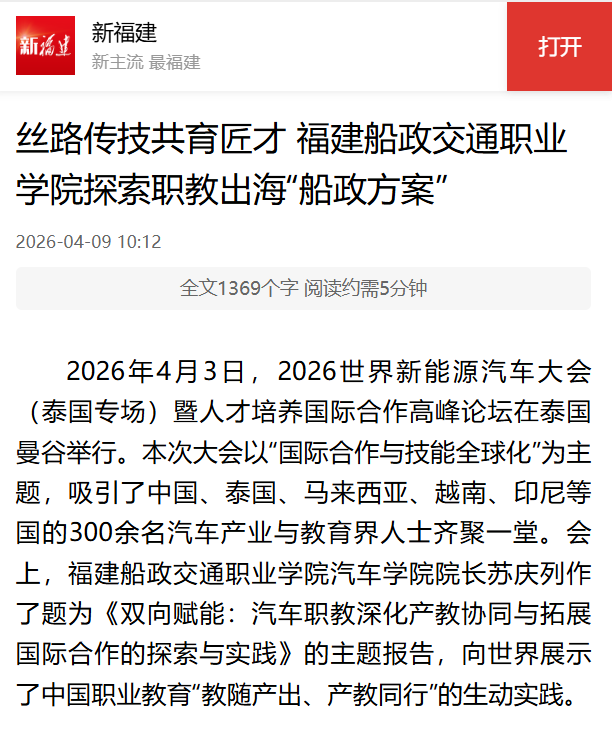 近日,新福建发布《丝路传技共育匠才 福建船政交通职业学院探索职教出海“船政方案”》,专题报道学院在2026世界新能源汽车大会上,分享汽车领域产教融合与国际合作的创新实践与成果,充分体现了学院坚持党建引领、党员教师扎根服务“一带一路”一线的责任担当。