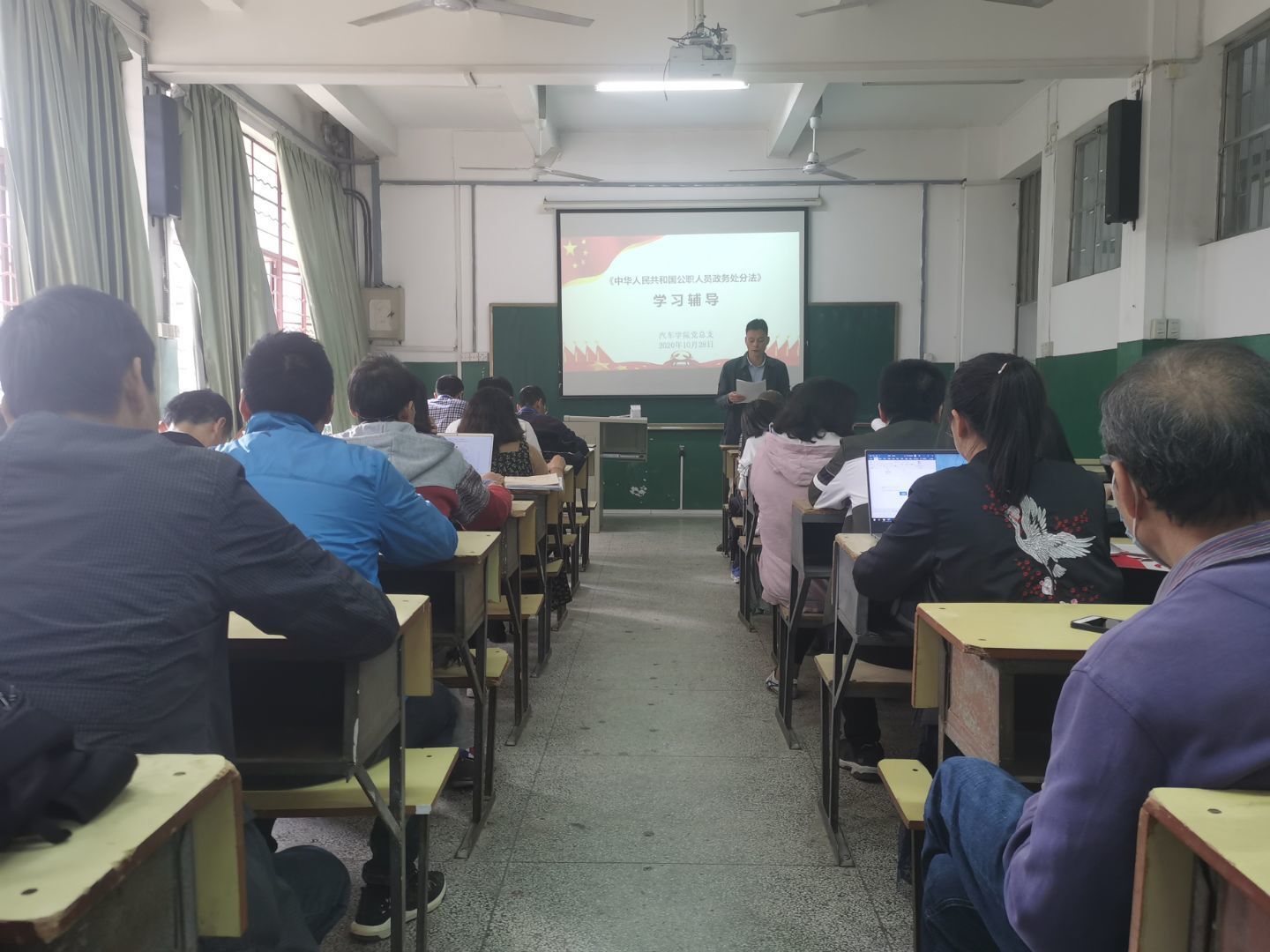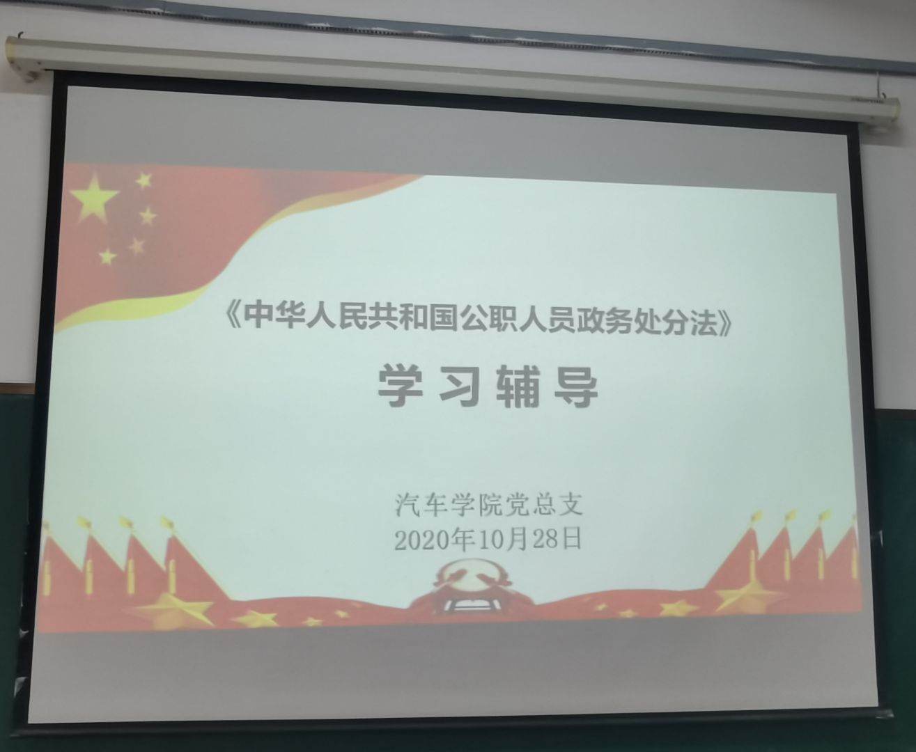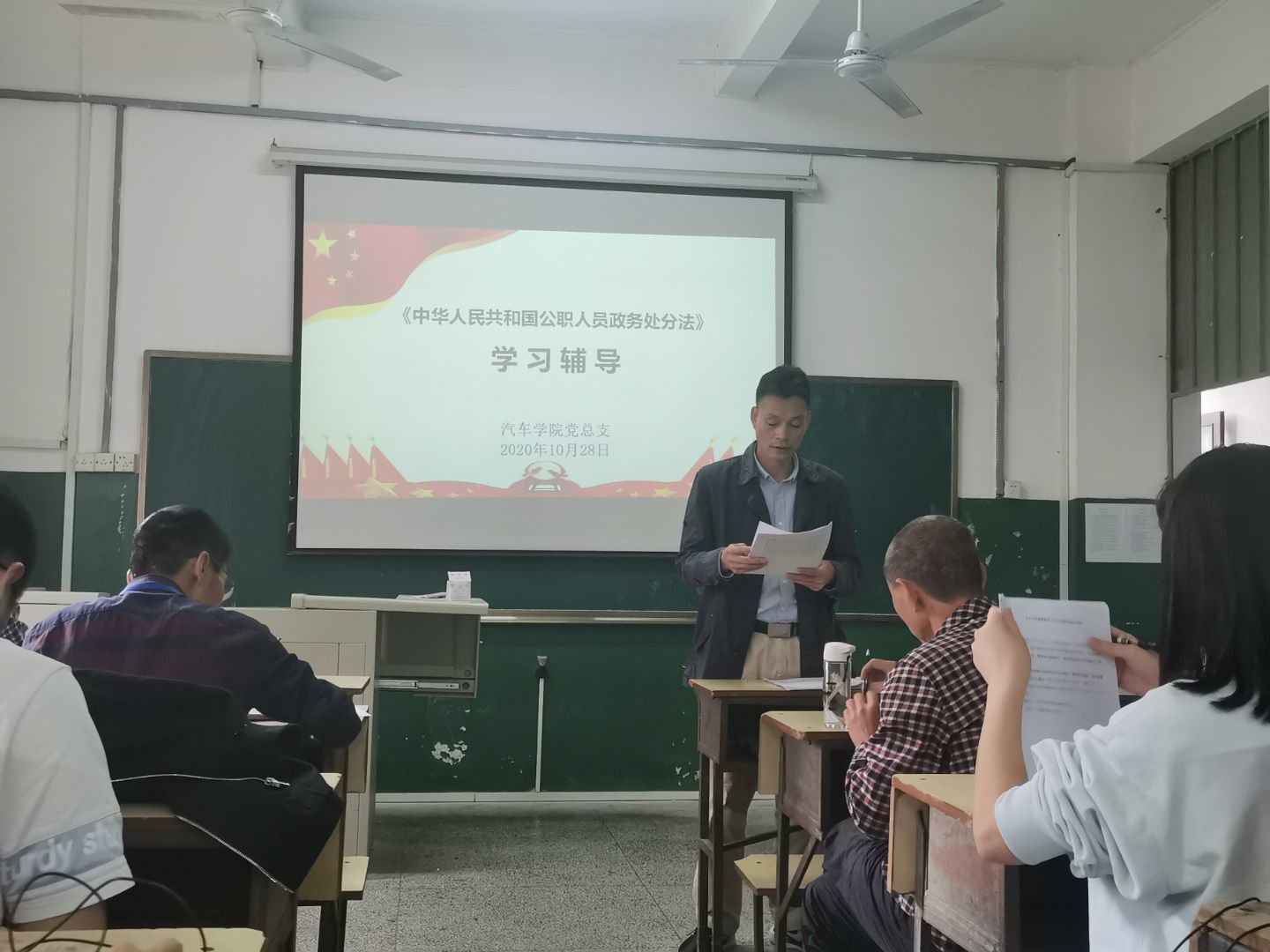 2020年10月28日下午在10号楼104教室,汽车学院全体教职工开展《政务处分法》学习会。