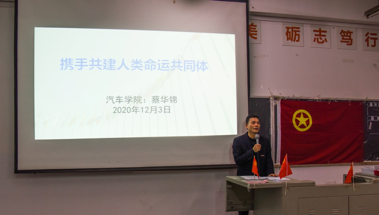 2020年12月3日,汽车学院在22号楼二阶教室举办了“形势与政策”课“携手共建人类命运共同体”专题讲座。讲座由汽车学院党总支书记蔡华锦主讲,100多名学生参加了讲座。