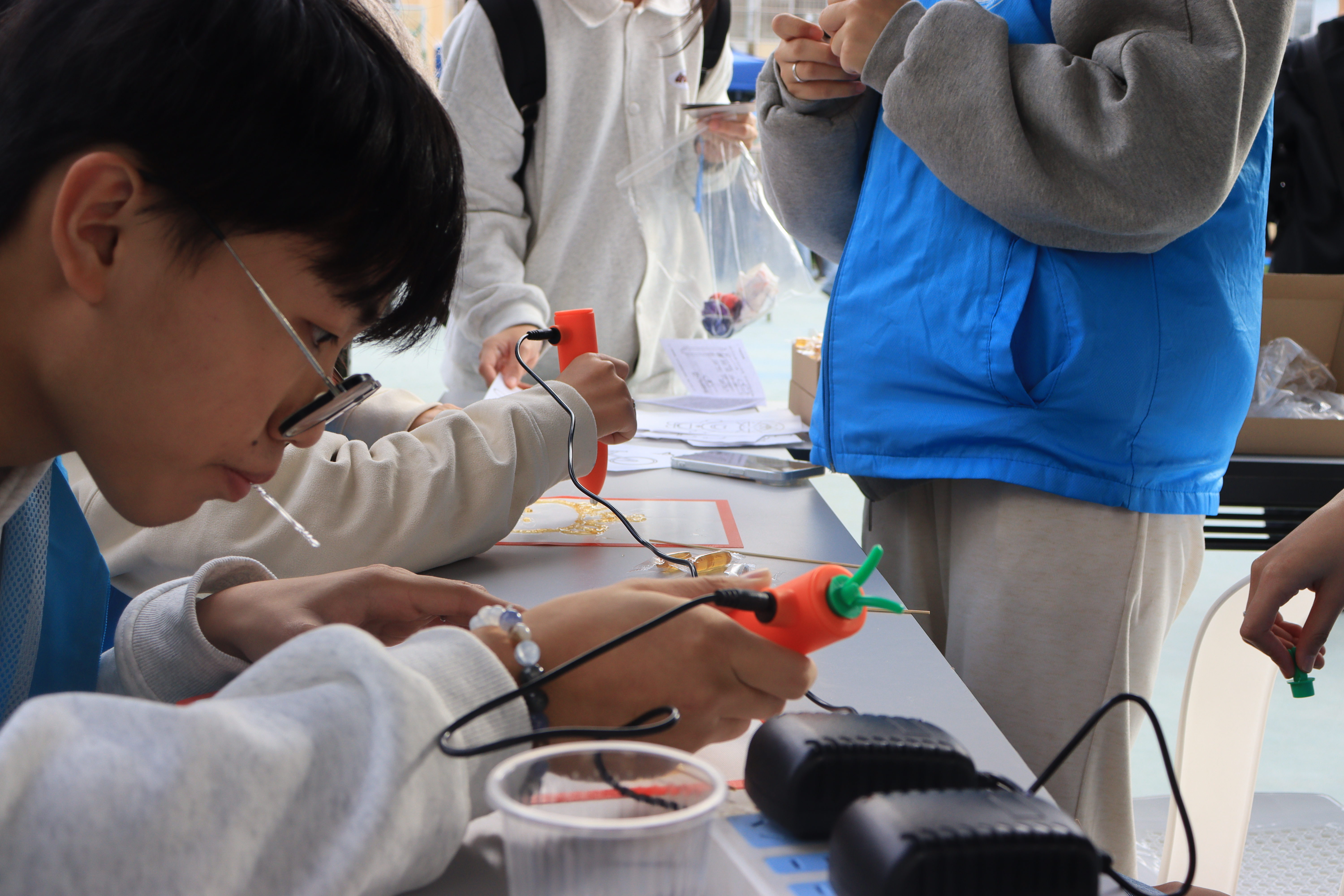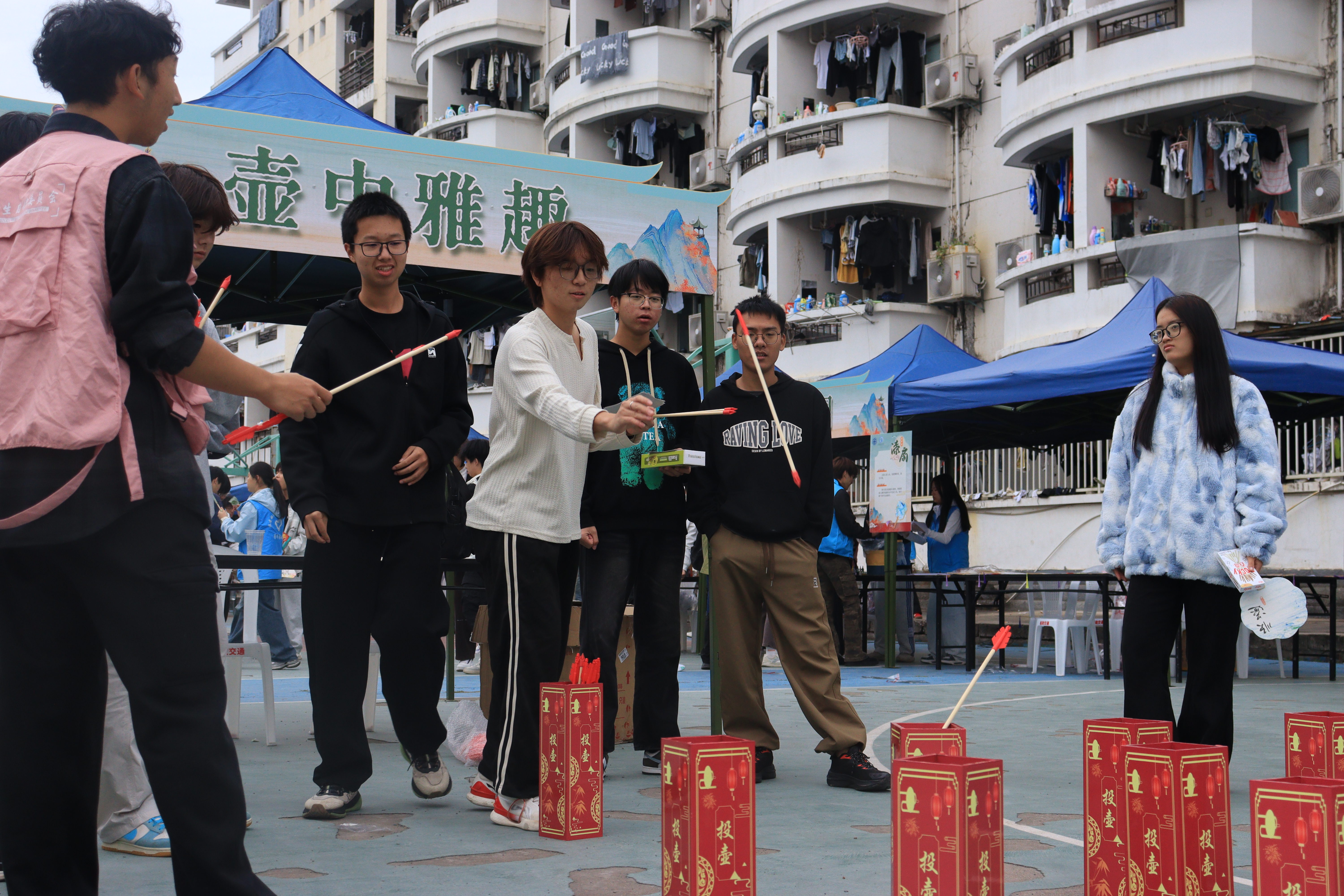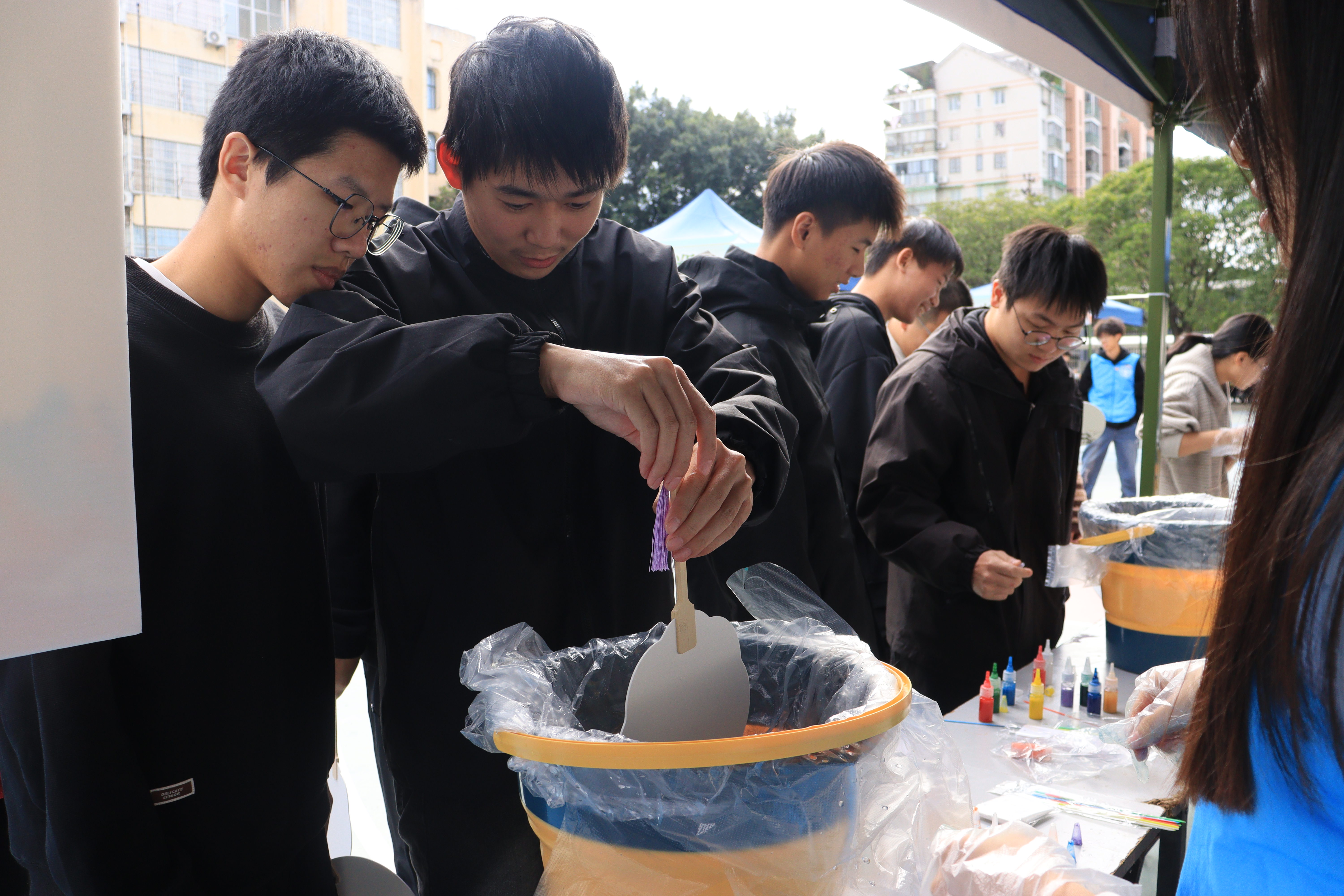 游戏区里,楹榫对章的古诗词对决、雅韵辩真的非遗推理、听鞠竞技的古风蹴鞠趣味十足,大家在欢声笑语中解锁传统文化密码;手作区更是人气爆棚,DIY糖画勾勒传统纹样、扎染创作独特肌理、串珠DIY打造专属国风饰品,非遗技艺在指尖焕发新生。同舟共济、心心相印等团队游戏中,室友们并肩作战、默契闯关,集齐印章兑换抽奖资格,惊喜好礼让快乐翻倍!