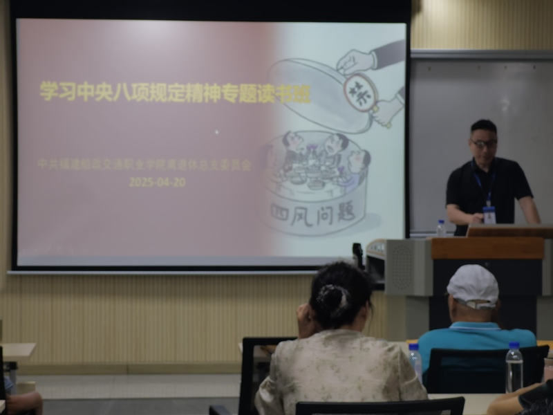 为进一步加强离退休干部党员的思想政治建设,4月20日,福建船政交通职业学院离退休党组织举办了专题读书班,将学习中央八项规定及其实施细则精神作为重要内容,组织广大离退休干部党员全面系统学习了习近平总书记关于加强党的作风建设的重要论述。