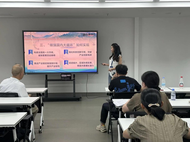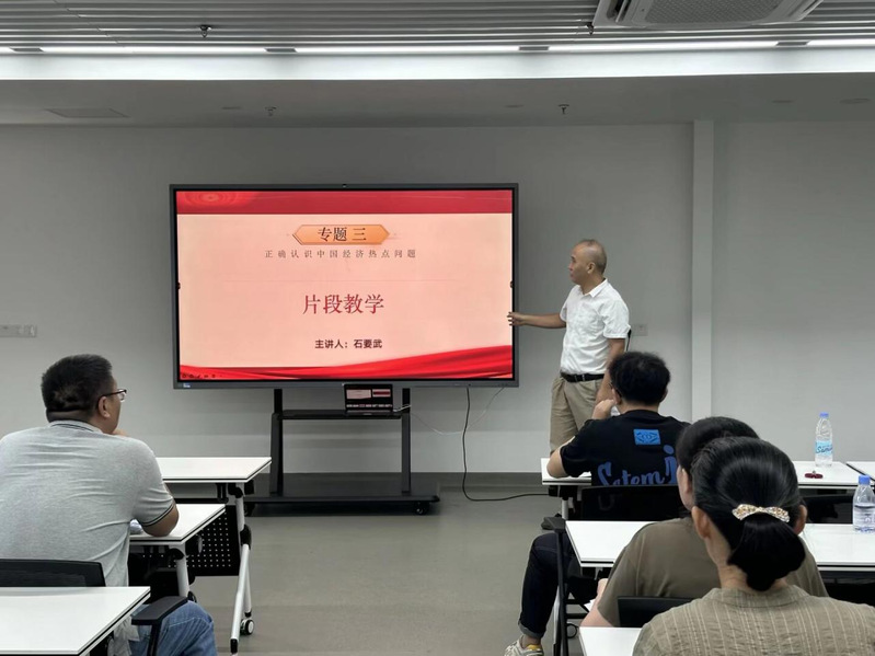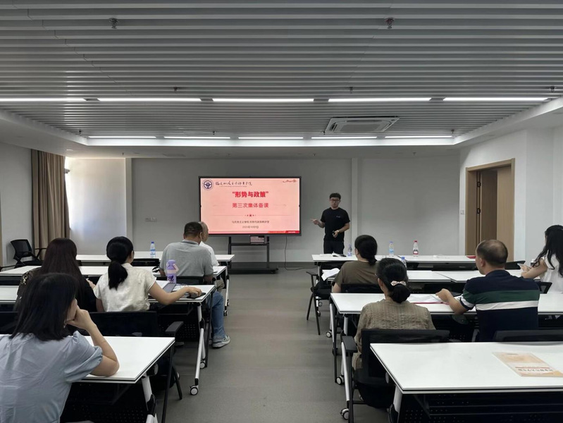 2025年9月25日,马克思主义学院形势与政策教研室在会议室开展了新学期第三次集体备课活动,聚焦“正确认识中国经济热点问题”专题,由连万桂老师主讲,石要武、陈艺老师进行片段教学示范。