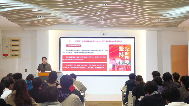 课堂上,张辉围绕“十五五”时期在基本实现社会主义现代化进程中的重要地位展开讲解。她从“党的领导的优势”切入,系统阐释了党中央权威和集中统一领导对确保政策落地的保障作用、党的创新理论对重大决策的科学指引价值,以及各级党组织和党员在发展改革中的先锋模范作用。结合职业教育发展实际与福建船政交通职业学院的办学特色,校领导还剖析了“十五五”期间职业教育面临的机遇与挑战,强调青年学生要立足专业、练就本领,将个人成长与国家发展紧密结合。