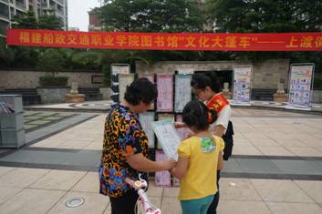 借着“世界读书日”来临之际,福建船政交通职业学院图书馆第六届 “书韵满校园 知识助远航” 读书月特别活动召开了,开展了一系列“文化大篷车”系列活动。图书馆“文化大篷车”系列活动有走进福州市上渡街道江南社区,走进福州市仓山区第四中心小学等为社区居民服务系列活动,活动展出《我们的文字》大型图片展、廉政图片展、大篷车系列活动书签设计比赛获奖作品,图书馆支部党员同志及大篷车义务导读员们现场为社区居民办理“福建船政交通学院图书馆社会读者借阅证”。活动还收集了大量的闲置图书,将用于图书馆文化大篷车后期开展的阅读活动,同时东南网对此次活动也进行了报道。
