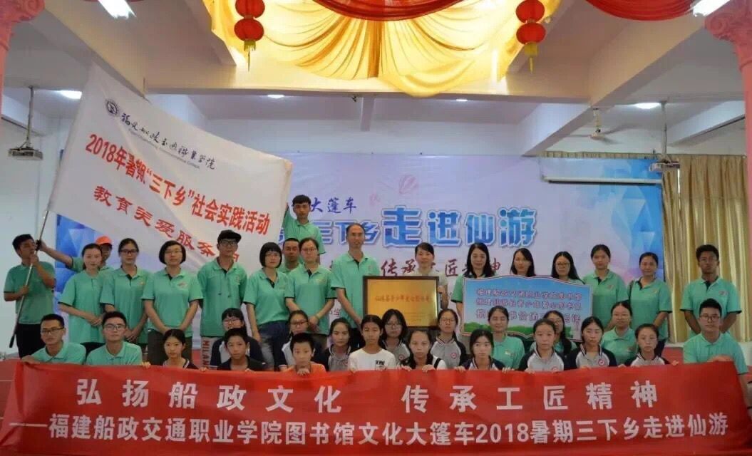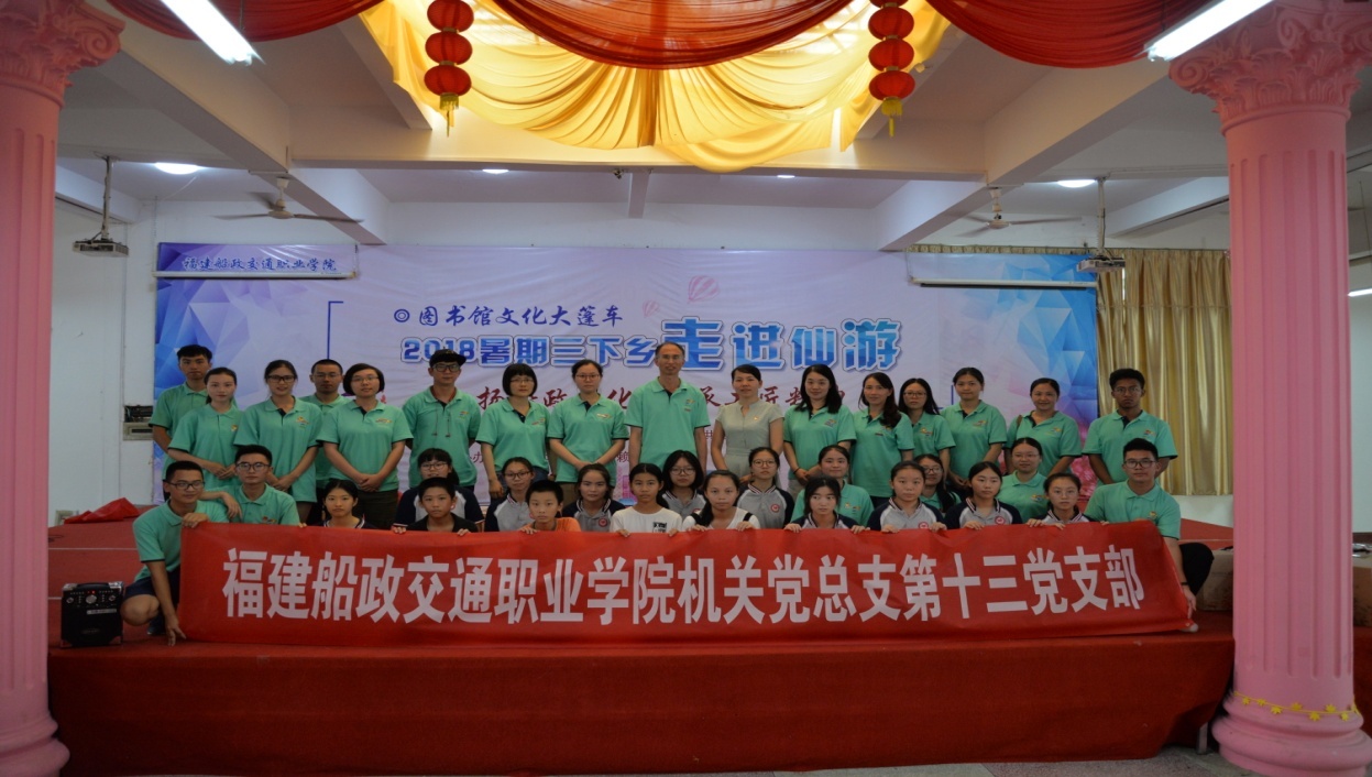 为深入学习宣传贯彻习近平新时代中国特色社会主义思想和党的十九大精神,围绕助力乡村振兴战略和精准脱贫,引导我院青年学生贡献青春智慧和力量,积极投身社会实践。2018年暑期,机关党总支第十三党支部带领图书馆思源志愿服务队共计25名师生依托 “文化大篷车”项目,组成了图书馆暑期三下乡“教育关爱服务队”,带着我院师生的爱心,通过以“弘扬船政文化 传承工匠精神”为主旨的一系列服务活动,在仙游开展了为期一周的暑期社会实践活动,将满满的爱意传递到仙游县市民的心中。