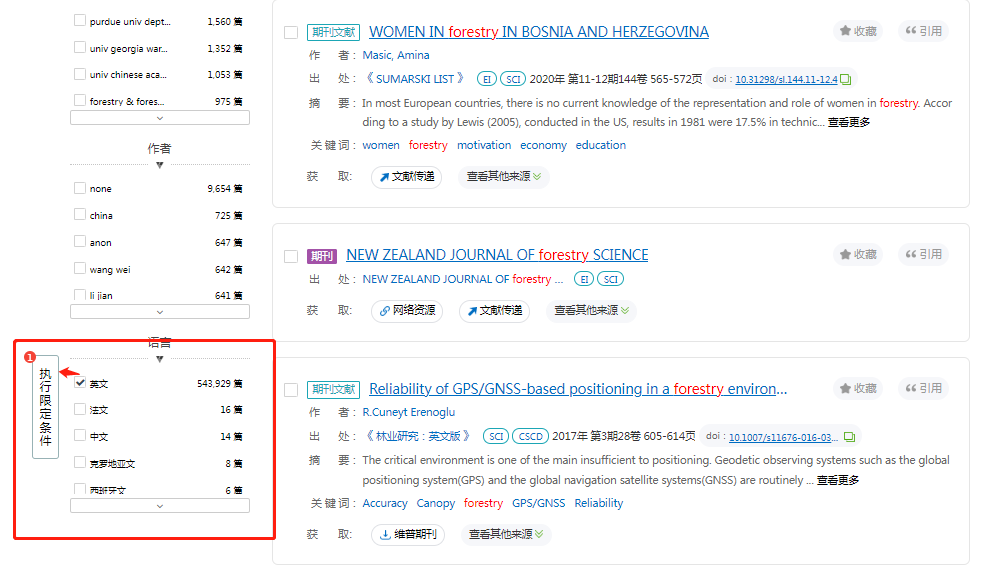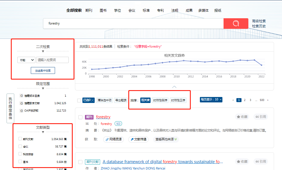 在经纶的首页可快速搜素5亿级文献数据的资源检索,搜索关键词“forestry”,有111万余篇文献,在左侧可进行二次筛选:举例:选择“学位论文”--点击“执行限定条件”,排序上可以选择“相关度、最新、正序”