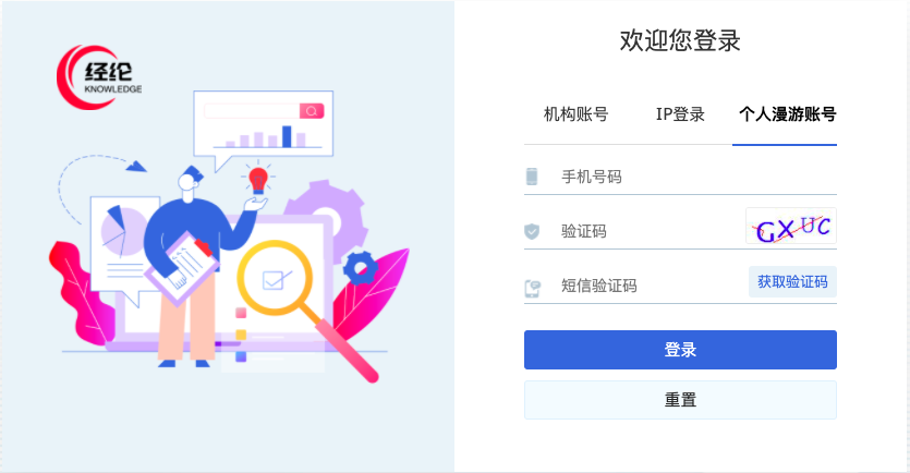 个人漫游账号:读者可在学校Ip范围内用手机号注册个人漫游账号。离开学校范围可用个人账号登录系统,无缝使用海量知识资源。
