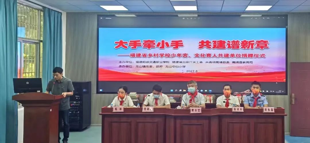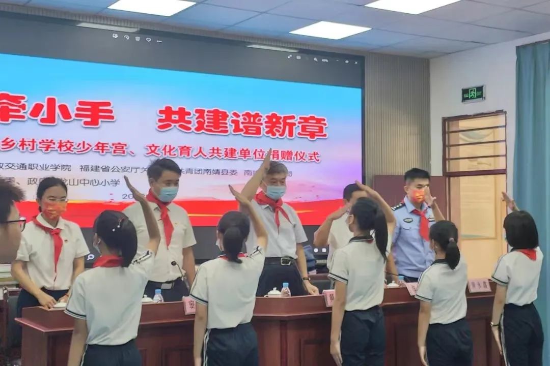 8月16日上午,我院党委委员、副校长张祖柱、省公安厅关工委常务副主任、秘书长黄永忠、省公安厅团委负责人、图书馆馆长陈林带领福建船政交通职业学院师生和省公安厅民警一行来到龙山中心小学,举行“大手牵小手,共建谱新章”——福建省乡村学校少年宫、文化育人共建单位捐赠仪式。南靖县委窦秉政副县长,县公安局、团县委、教育局、龙山镇等部门相关领导参加活动。