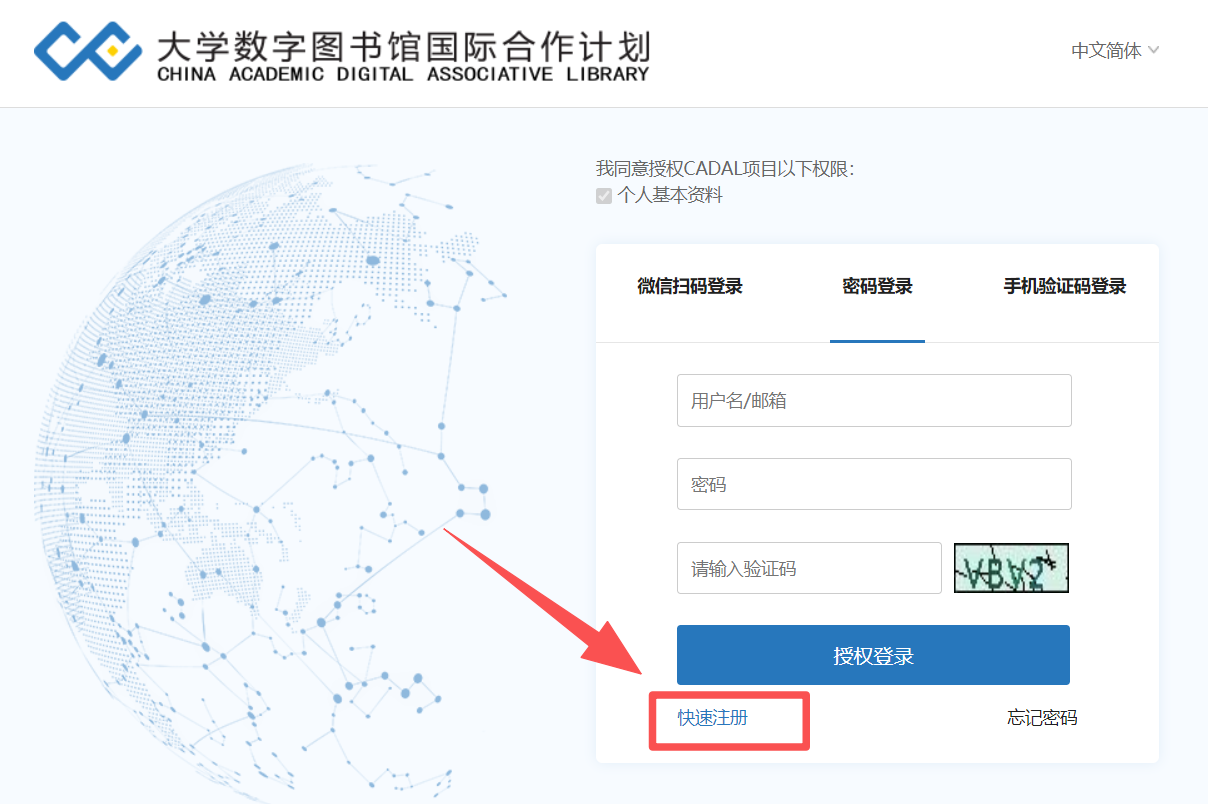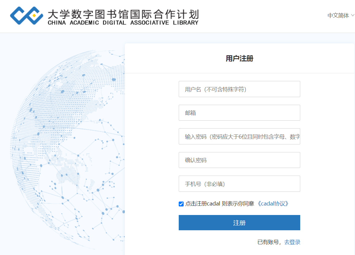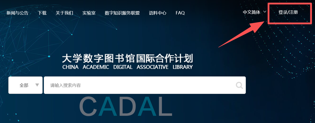 访问CADAL官网(搜索:大学数字图书馆国际合作计划),点击右上角“登录/注册”即可打开登录页面。
