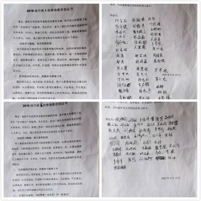 为了让高校大学生了解毒品的危害,通用航空产业学院辅导员范声斌、辅导员庄智群,于9月15日组织全院学生通过手机端观看《别让“我以为”变成“我后悔”》禁毒宣传教育片,通过触目惊心的图片影像资料生动形象的展示了毒品的种类,毒品对身体、家庭、社会、国家的危害性,教育青少年学生如何防范新型毒品,教导青少年远离毒品,珍爱生命。观看后学生纷纷发表心得体会,并签署禁毒教育倡议书。