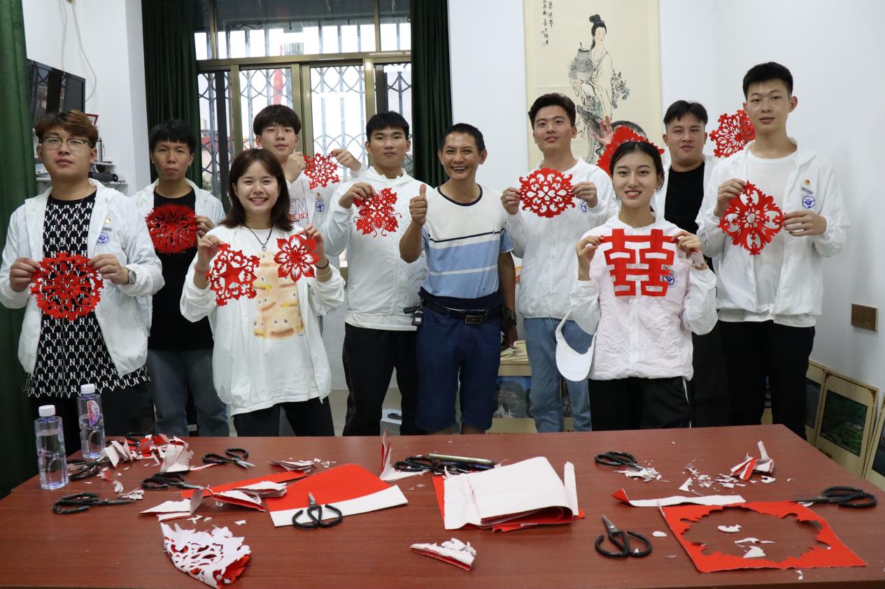 彩扎介绍完后林老师为队员们展示起剪纸的技艺,只见林老师低着头不看纸,一手一剪,纸片上下翻折,碎纸似飞蝶般纷纷飘落,一副美丽的窗花就在队员们面前逐渐成型。