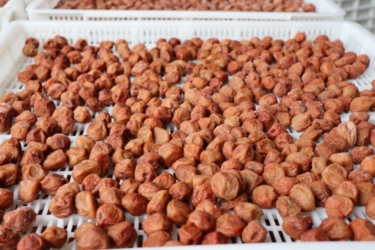 队员们带上口罩、防尘头套,对手部、鞋底进行消毒杀菌处理,净化衣服上的尘埃微生物。经过一系列卫生处理后队员们进入了食品加工间。了解了青梅蜜饯的制作流程,从采摘、清洗、腌制、日晒、分级、去杂质、去核、调味、过滤、糖渍到晾晒历经11道工序。