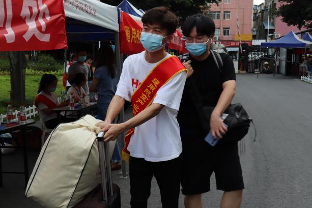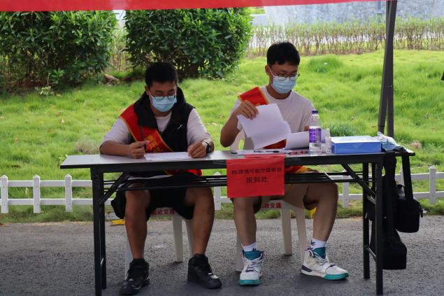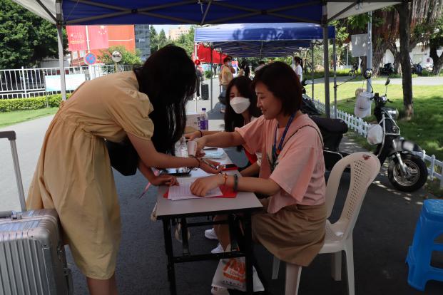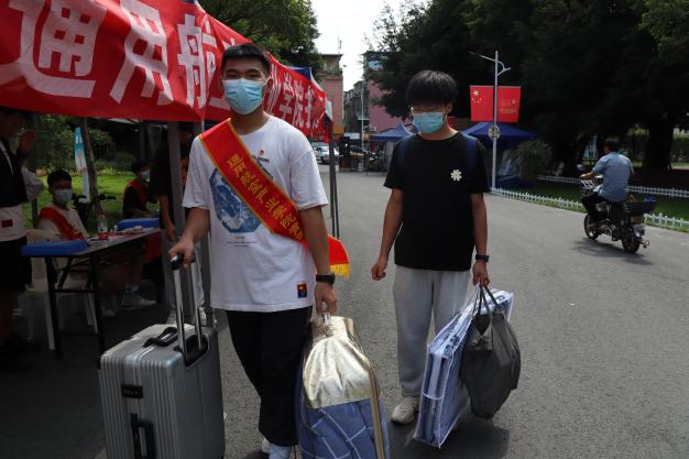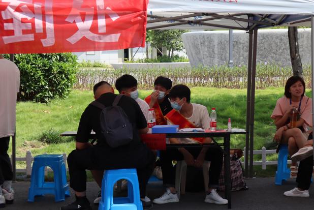 学院报到处,“同学,你好,欢迎回家!”“同学,你好,请出示健康码、大数据通信行程码、核酸检测报告。”