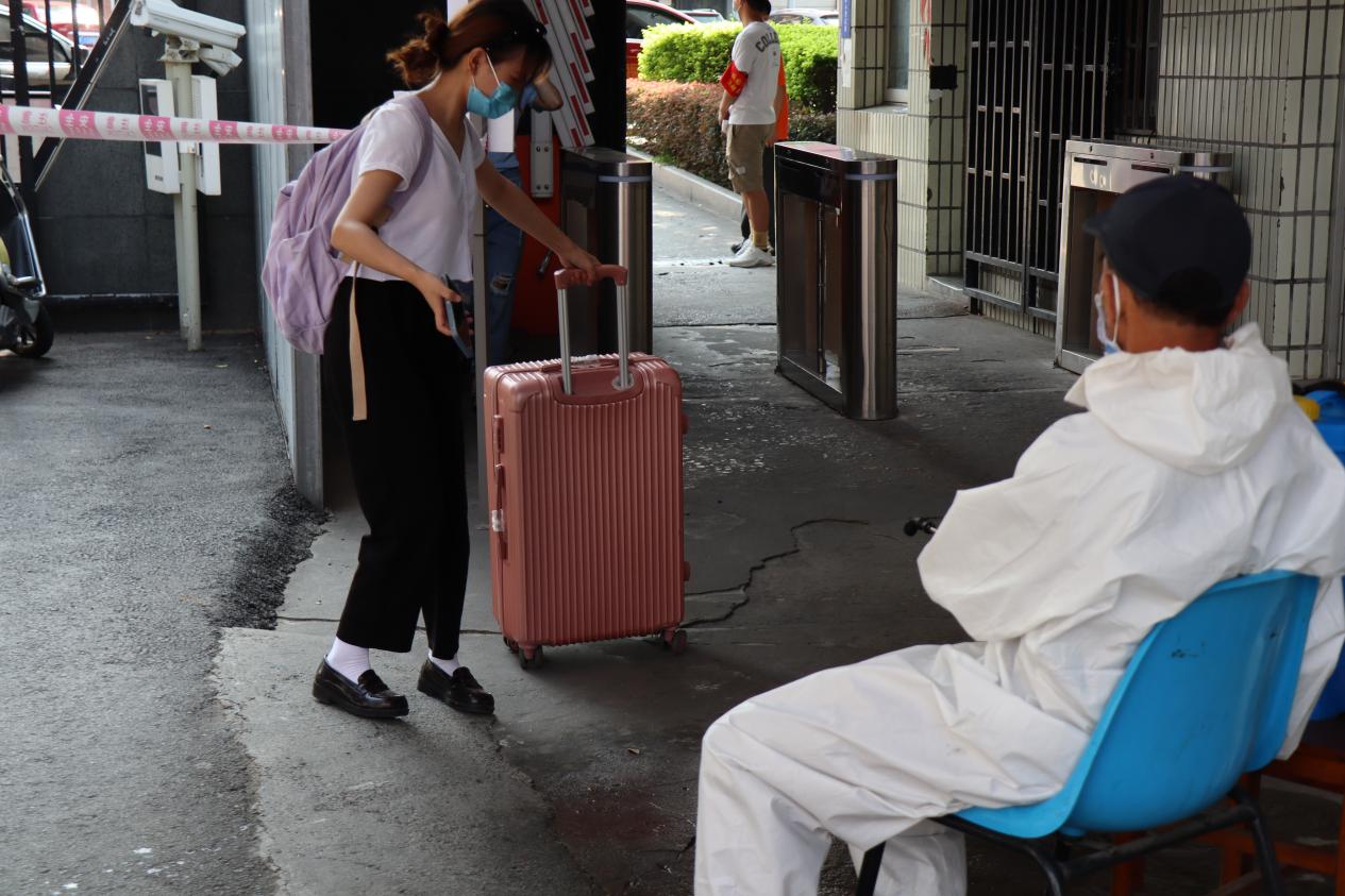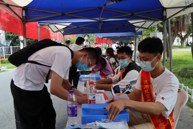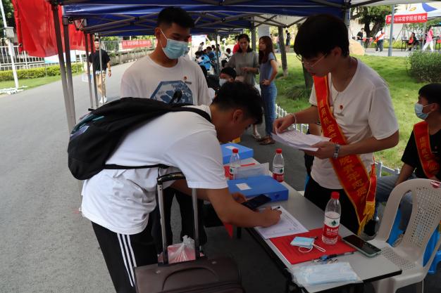 船政南区校门,同学们佩戴口罩,进行测量体温,同时对随身物品进行消毒后方可进入前往报到处。