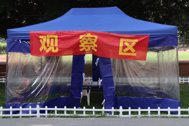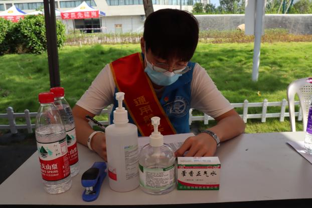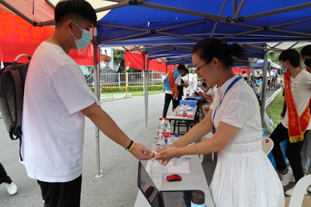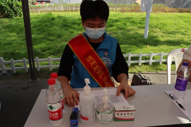返校当天早晨,相关工作人员和志愿者们就提前来到学生返校报到现场,清点防疫物资,统一佩戴防护口罩并进行体温测量。