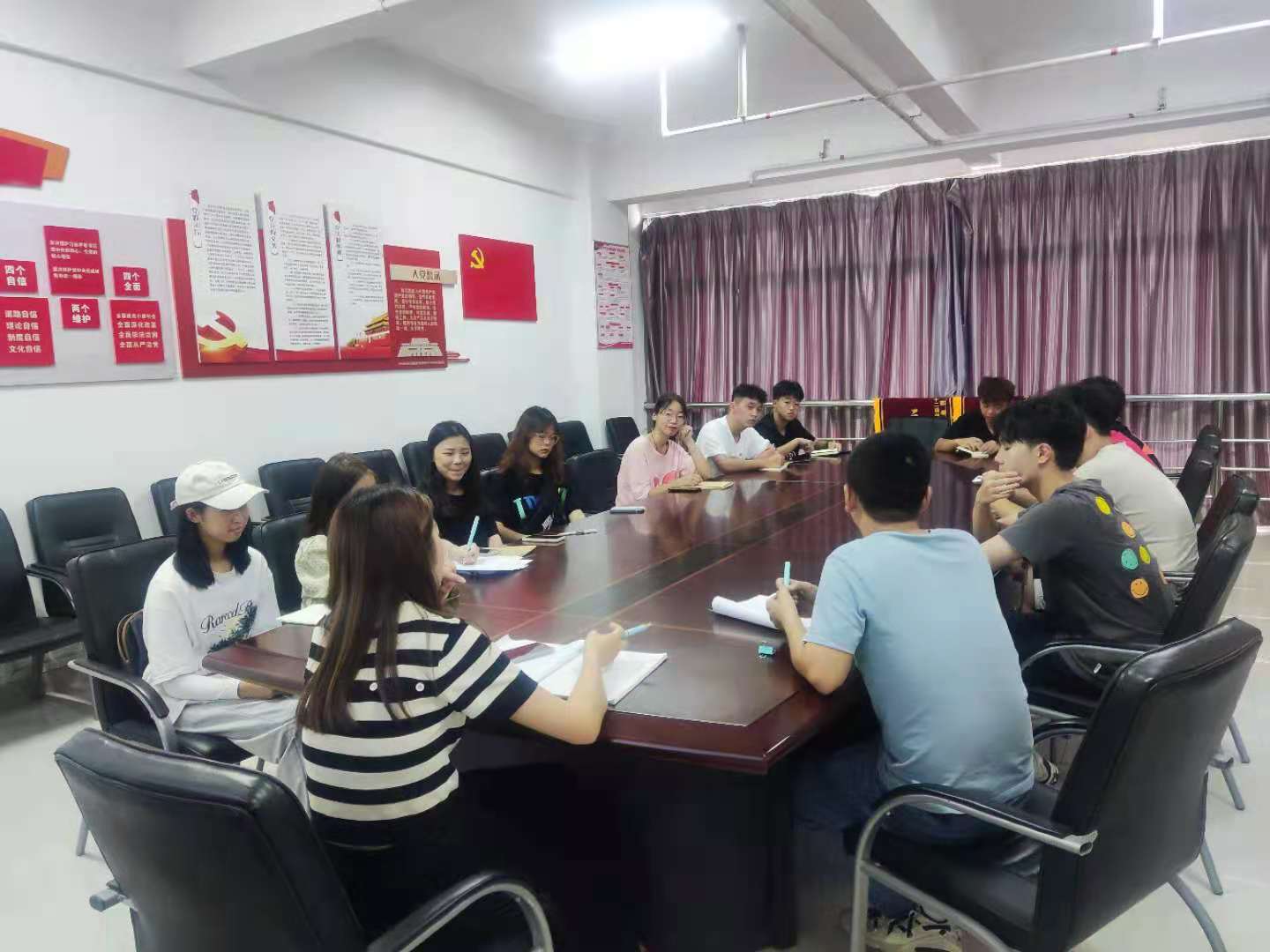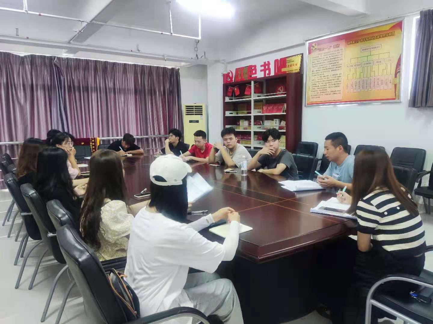 助教们认真听讲,做笔记学习,并且询问在工作中遇到的问题,辅导员帮忙答疑解惑,会议最后辅导员各班助教,开学前新生工作,新生报道后的工作安排。