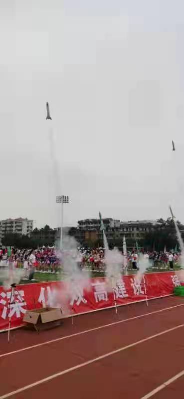 十枚易拉罐制作的模型火箭与一枚长征二号仿真火箭腾空而起