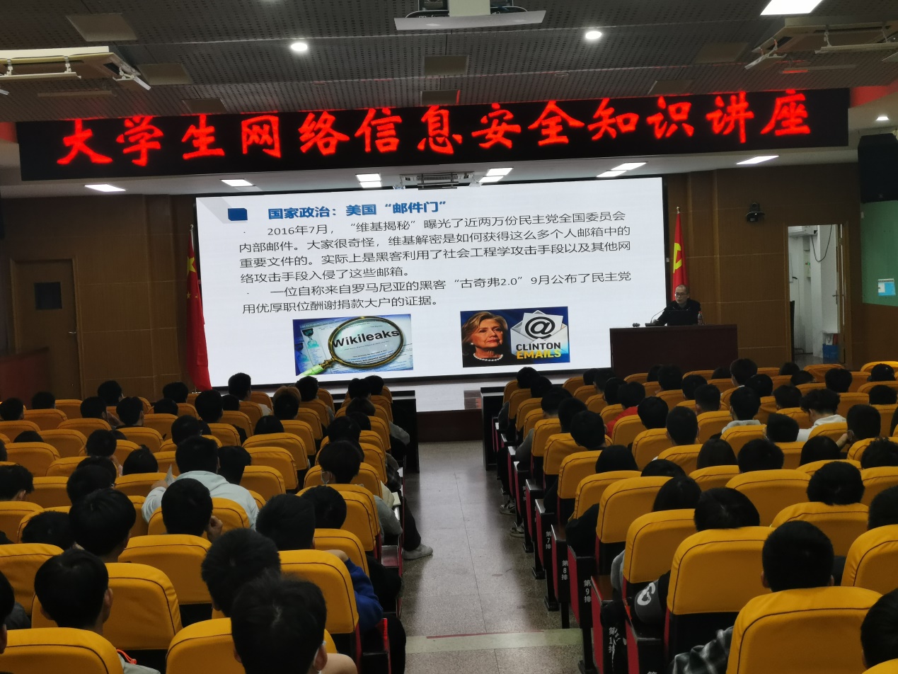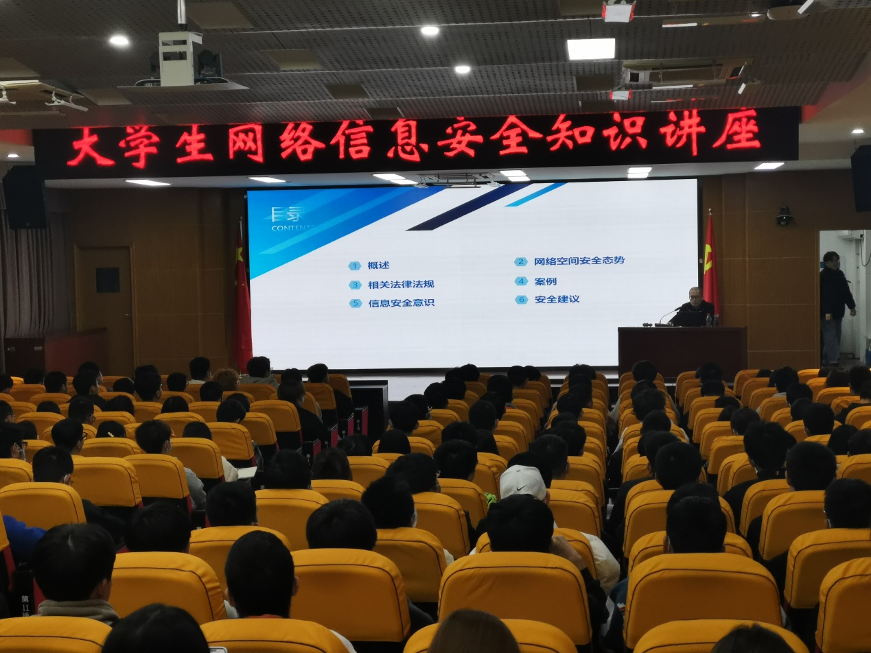 数据中心副主任高级工程师江涛围绕网络信息安全意识培养展开,共分为三个模块:一是“国家网络安全形势分析”。中国已成为世界网络大国,但网络安全仍面临着严峻挑战和考验。二是网络信息安全的相关知识,围绕什么是网络信息安全进行剖析。三是“常见网络安全风险与应对方法”。列举出了木马病毒、信息泄露、密码管理、电信诈骗等七种常见的网络安全风险。指导大家如何保护网络信息安全,促进提升网络信息安全素养和安全防范能力。同时警示同学们即使身处“象牙塔”也不能掉以轻心,要谨慎运行不明后缀的文件,保护好个人数据,加强对密码的管理,防范网络风险