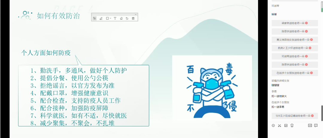 疫情期间听从学校安排认真对待网课,按时出勤、提交作业,积极与任课教师进行互动,同学要做到早睡、早起、不熬夜,不沉迷于手机和电脑。