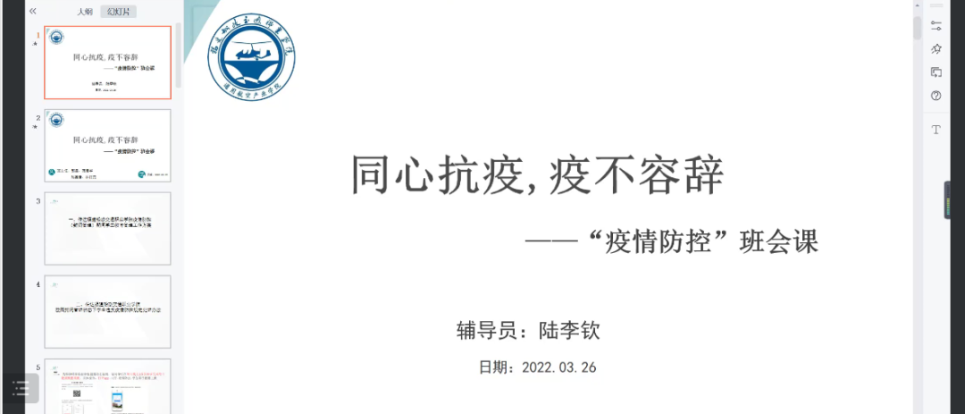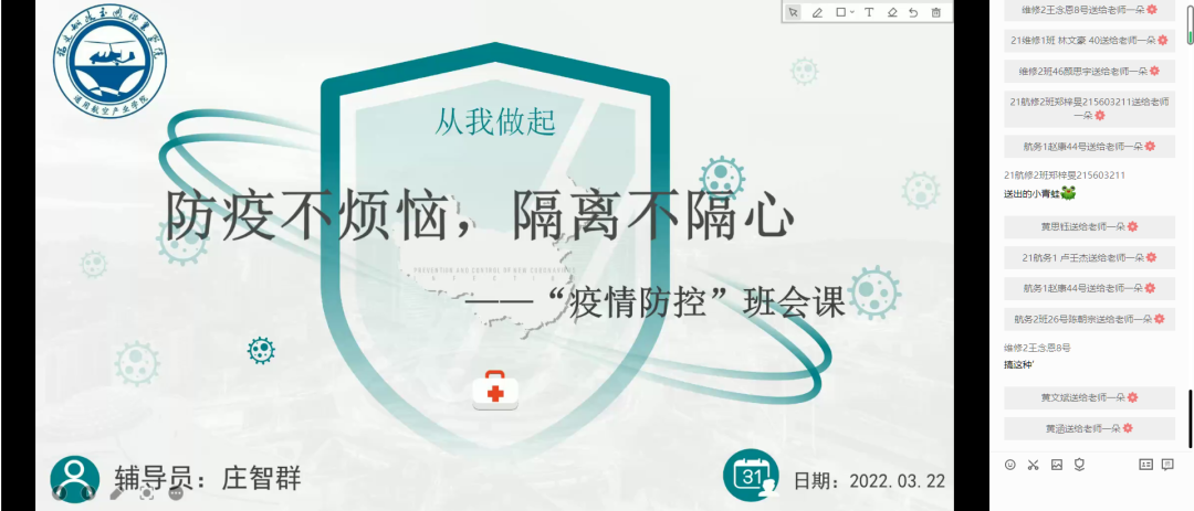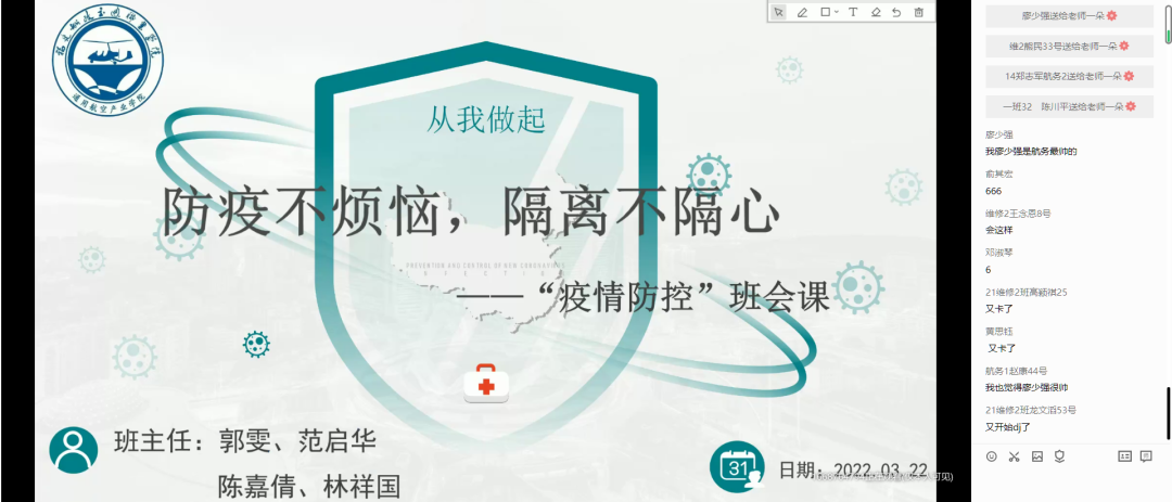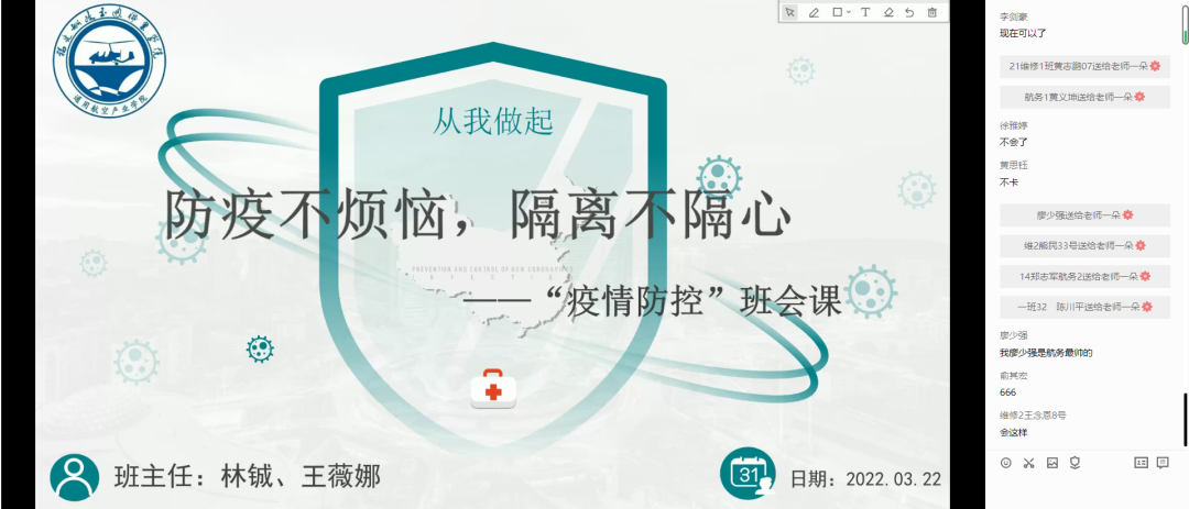 疫情当前,通用航空产业学院领导、辅导员、班主任和老师们一刻也不敢放松,时刻关注学生身体和心理健康,加强与学生的联系,保持和学生家长沟通,为进一步做好疫情期间学生的安全管理和心理健康工作,加强疫情防控期间的学风建设,本院多次召开疫情防控线上主题班会。