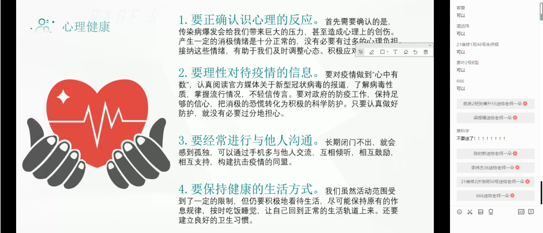 各班级辅导员和班主任号召学生在疫情防控期间做好自身健康防护,提升自身防护意识和能力,引导学生从合理作息、线上学习、体育锻炼和休闲娱乐等四个方面进行时间的科学管理,全方位了解学生动态和诉求,引导学生积极做好线上学习,进一步完善时间管理规划,做时间的主人,遇见更好的自己。