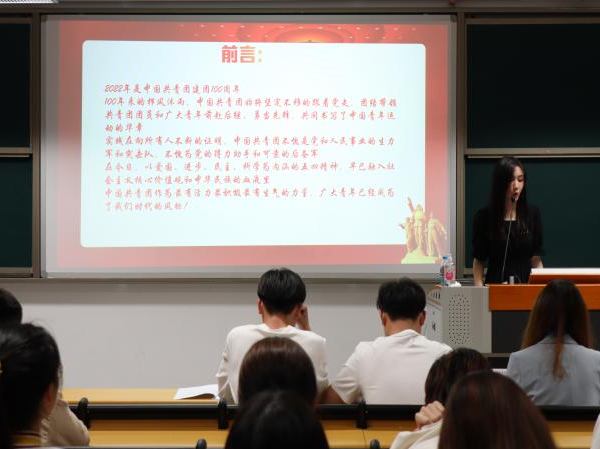 一段段鲜活的故事,一个个深刻的感悟,一次次打动着在场的每一个人,掌声此起彼伏。选手们以激情澎湃,感人肺腑的演讲,别具一格的视频展示,给观众带来听觉、视觉的震撼。作为祖国的新一代接班人,我们胸怀强烈的历史责任感、使命感。回首百年团史,我们的心绪就像大海的波涛,久久不能平静,中国共产主义青年团在党的带领下,组织下,在中华文明历史逻辑、现代化发展逻辑和共产主义运动逻辑的共同推动之下得以诞生和发展。我们要用马克思列宁主义、毛泽东思想和现代科学文化武装自己,做促进改革开放的模范,做遵守职业道德和社会公德的模范,做学习和维护社会主义民主、守法遵纪的模范,做维护民族团结,在两个文明建设的实践中,锻炼成为有理想、有道德、有文化、有纪律的优秀青年。青年人要有“敢教日月换新天”的坚定信念,“千磨万击还坚劲”的强大意志和“乱云飞渡仍从容”的非凡定力,方能凝聚起实现中华民族伟大复兴中国梦的磅礴伟力。“以青春之我,创建青春之家庭,青春之国家,青春之民族。”27岁时李大钊写下的誓言,仍是吾辈所求。实现第二个百年奋斗目标新的赶考之路,青年人定能写下不负党和人民的精彩答卷。