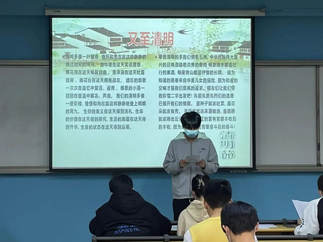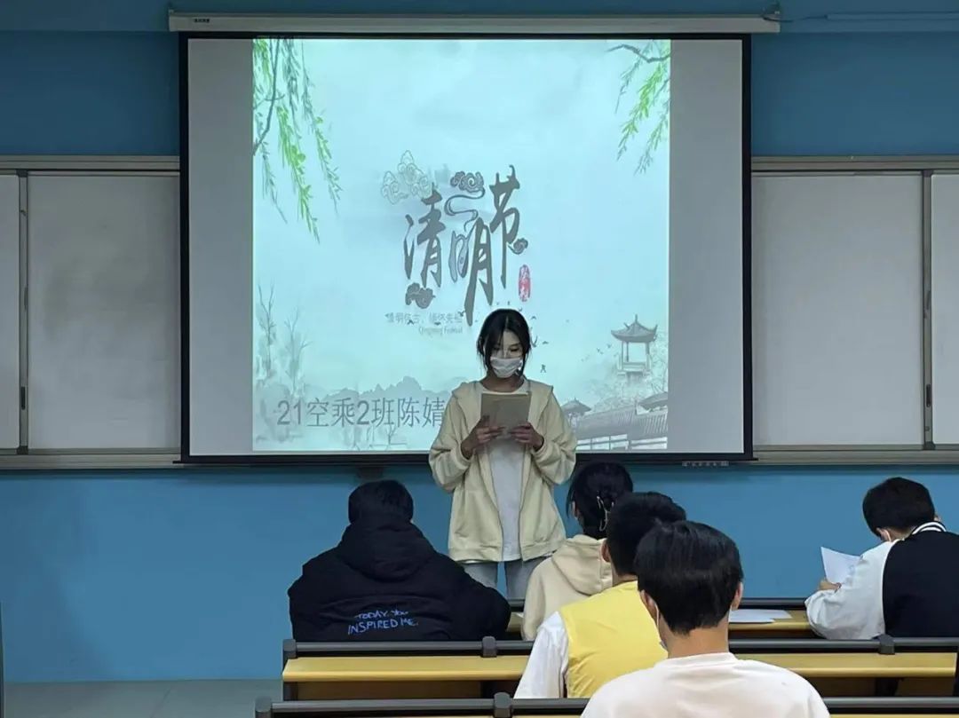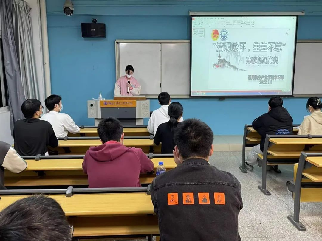 清明节是二十四个节气中最具人文历史的节日,既是祭奠祖先、缅怀先人的节日,又是一个远足踏青、亲近自然、催护新生的春季仪式。为弘扬继承中华民族优秀传统文化和红色文化,更好地缅怀故人,缅怀先烈,深化感恩教育,传承中华民族的传统美德,弘扬以爱国主义为核心的民族精神,通用航空产业学院学习部于2022年4月5日在南区经管楼308开展“清明咏怀,生生不息”诗歌朗诵比赛,激发学生朗诵诗歌和创作诗歌的兴趣,提升学生的文化素养,陶冶学生的道德情操,让经典诵读成为学校文化立校的正能量。