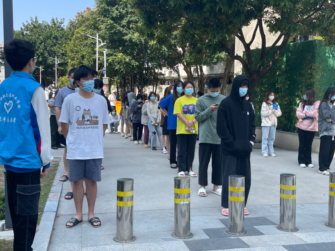 活动开展过程中,同学们在志愿者的组织下,井然有序地排好队,都保持着一米间隔等待核酸检测。