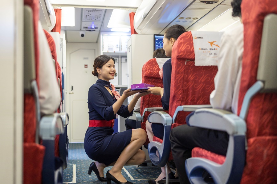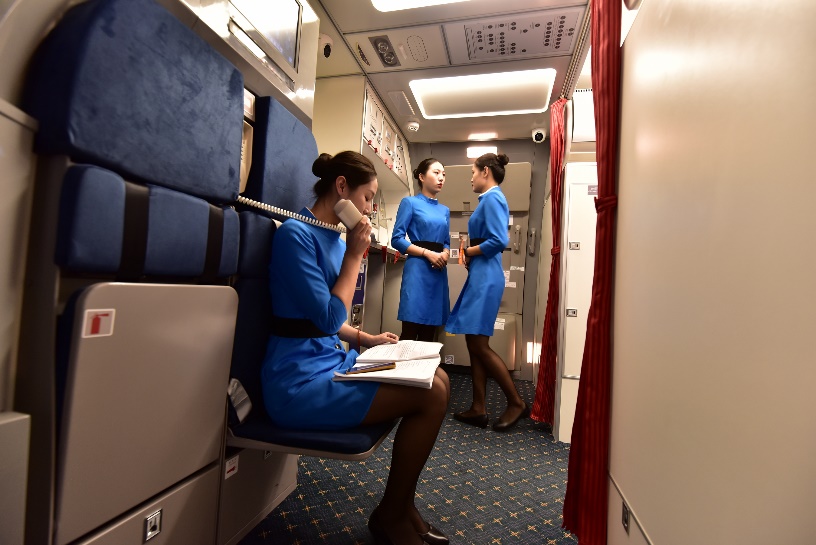 在课上,空中乘务的老师及同学用灿烂的笑容和专业的素质共同模拟演示了客舱服务的全过程以及各种突发情况,包括迎接乘客登机、安全演示、客舱餐饮与娱乐服务、欢送乘客下飞机等。空中乘务的同学们能明确并熟悉客舱服务的工作程序及相关内容要求,很好地展现空中乘务员的职业形象和专业素养,并能熟悉客舱安全规则、安全管理,能完整而又准确地提供客舱正餐服务,同时也展示了航空学子忠诚担当、严谨科学、团结协作、敬业奉献的专业精神。
