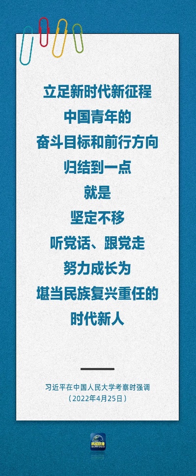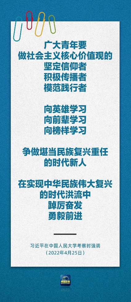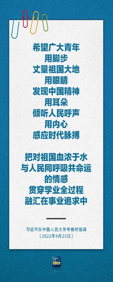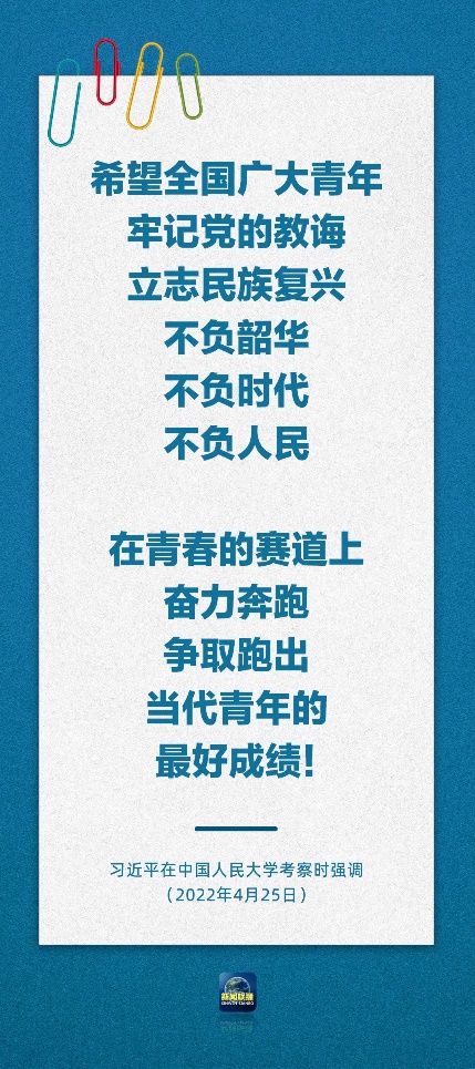 在五四青年节即将到来之际,中共中央总书记、国家主席、中央军委主席习近平4月25日上午来到中国人民大学考察调研。习近平代表党中央,向全国各族青年致以节日的祝贺,向中国人民大学全体师生员工、向全国广大教育工作者和青年工作者致以诚挚的问候。习近平希望全国广大青年牢记党的教诲,立志民族复兴,不负韶华,不负时代,不负人民,在青春的赛道上奋力奔跑,争取跑出当代青年的最好成绩!
