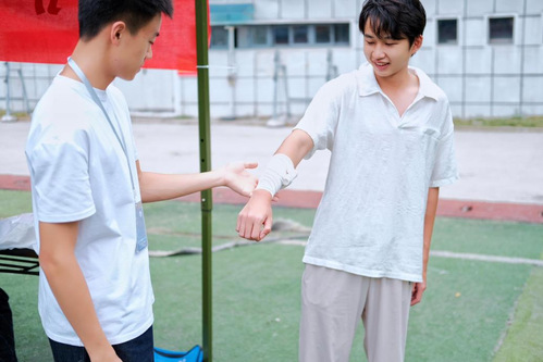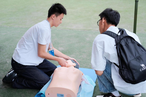活动通过趣味问答、现场演示等丰富形式,吸引了大量同学参与。抽象的急救知识在互动题目中变得直观可感,激发了大家的求知欲。随后的实操环节中,在志愿者“手把手”的教导下,同学们纷纷拿起三角巾和绷带,为同伴模拟包扎头部与四肢,认真练习止血与固定技巧。心肺复苏(CPR)教学更是将气氛推向高潮,志愿者不仅详尽演示,更引导同学们逐一在模拟人上实践,确保要领深入人心。整个现场互动频繁,讨论热烈,洋溢着积极向上的学习热情。