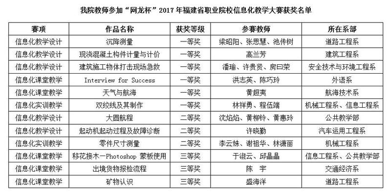 日前,从“网龙杯”2017年福建省职业院校信息化教学大赛上传来喜讯,经网络初评和现场决赛,我院参赛教师取得一等奖作品6件、二等奖作品3件、三等奖作品3件的优异成绩,一等奖作品获奖数和参赛作品获奖总成绩均位居全省高职院校首位。