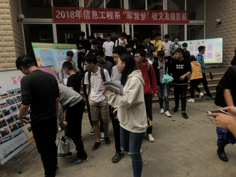 信息工程系于20181112日至20181114日在北区2#1楼举办了信息工程系“军营梦”征文及摄影展,此活动旨在展现我校2018级新生军训风采。该活动通过摄影图片展示的形式,力求从摄影的角度来表现新一届船政学子的精神风貌,并为所有爱好摄影艺术的船政师生搭建一座展示其摄影技巧,记录发现,表现创意的平台。并且20172018级的船政学子以征文比赛的形式表达了对祖国的热爱,并且与军训照片一同展出。