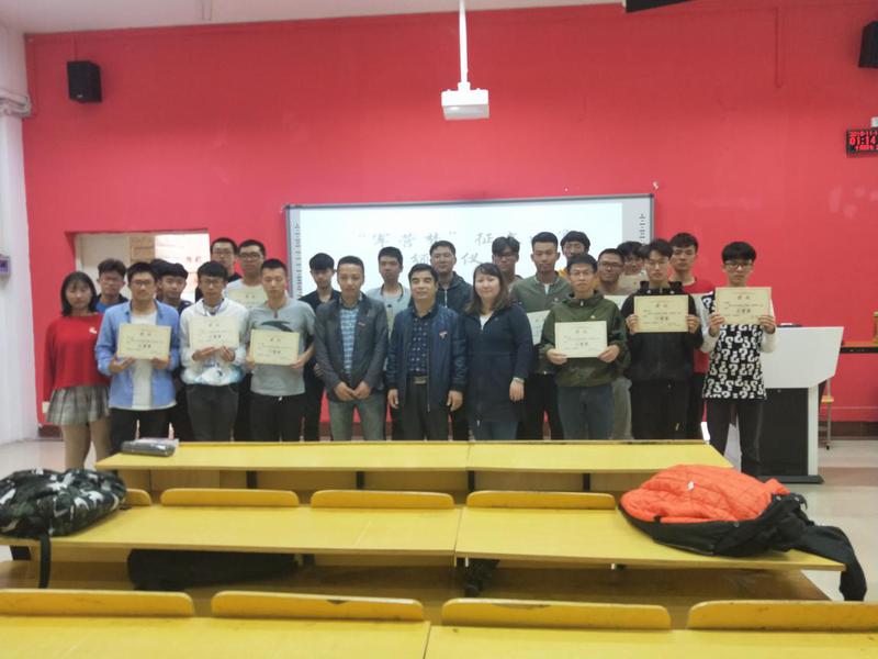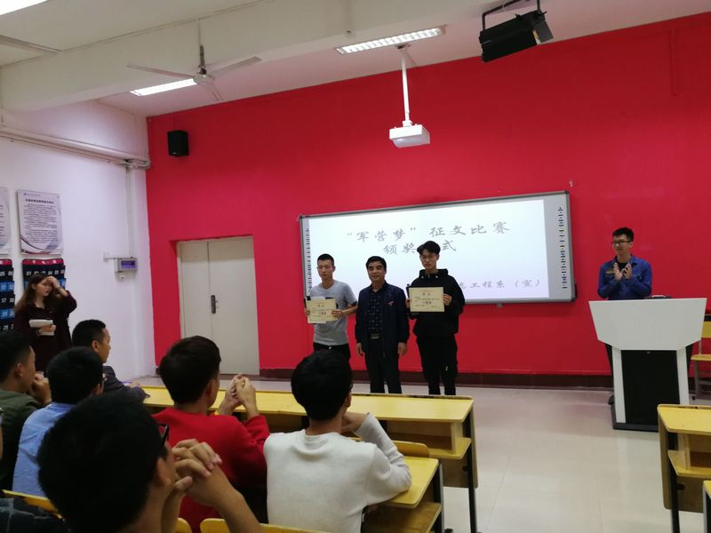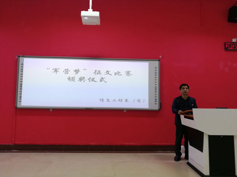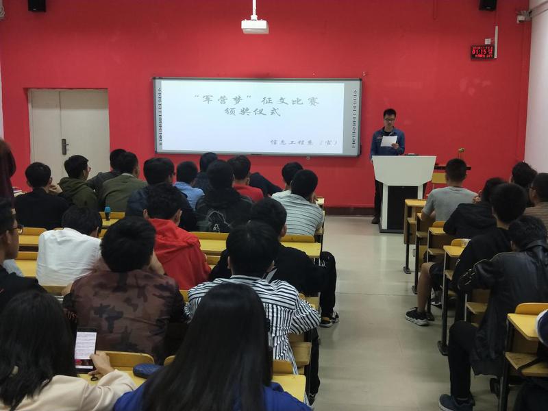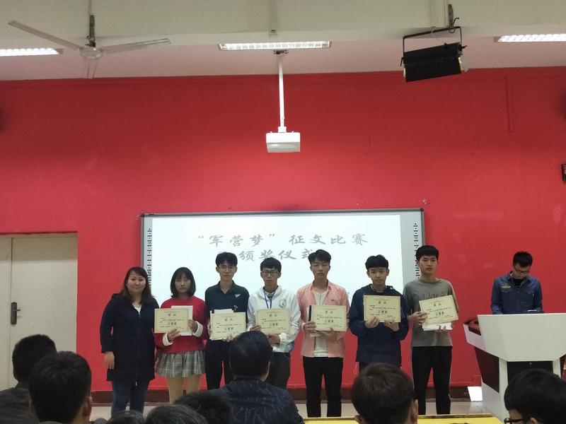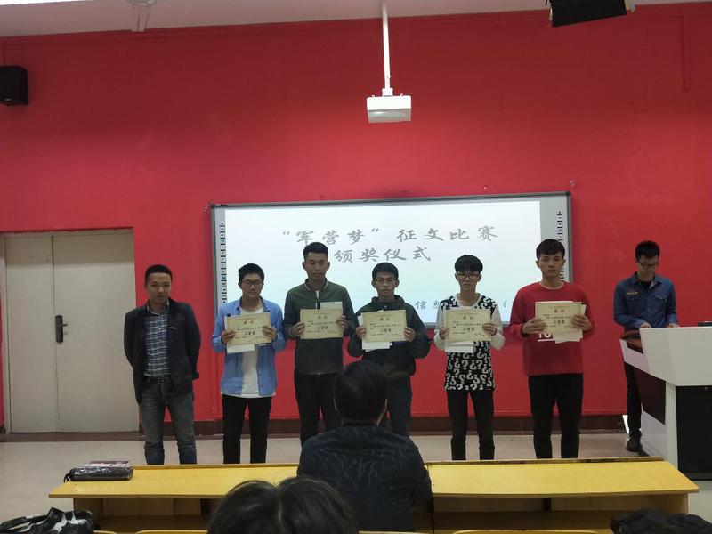 为弘扬爱国主义精神,营造爱国热情的学院风范。20181114日下午1300在船政北区2#1-5举行了“军营梦”征文比赛颁奖仪式。信息系系书记孙基老师、征兵负责人唐晓军老师以及“军营梦”征文比赛负责人2017级辅导员黄华梅老师。本次颁奖仪式由2017级电信班唐宋杰主持。