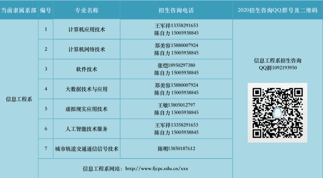 信息工程系现开设有计算机应用技术、软件技术、计算机网络技术等7个专业。其中,计算机应用技术专业成立于2002年,是首批国家示范性高职院校重点建设专业、教育部骨干专业和福建省级示范性专业。信息系现有2个省级实训基地,5个省级技能竞赛基地,拥有计算机网络技术专业国家级和软件技术省级现代学徒制试点项目,省级精品课程、专业带头人、创新创业专业、创新创业教学资源库、现代学徒制专业、生产性实训基地等,专业建设和人才培养质量逐年提升。现有设施完善、功能齐全的专业技术实训室20个和一个远程实时教学中心。同时,在“十三五”期间,已立项建设省级VR实训基地,省级信息技术与智能交通专业群示范实训基地等,新建成高水平的专业技能实训室和校外实训基地,为学生提供更好的学习及实践环境。