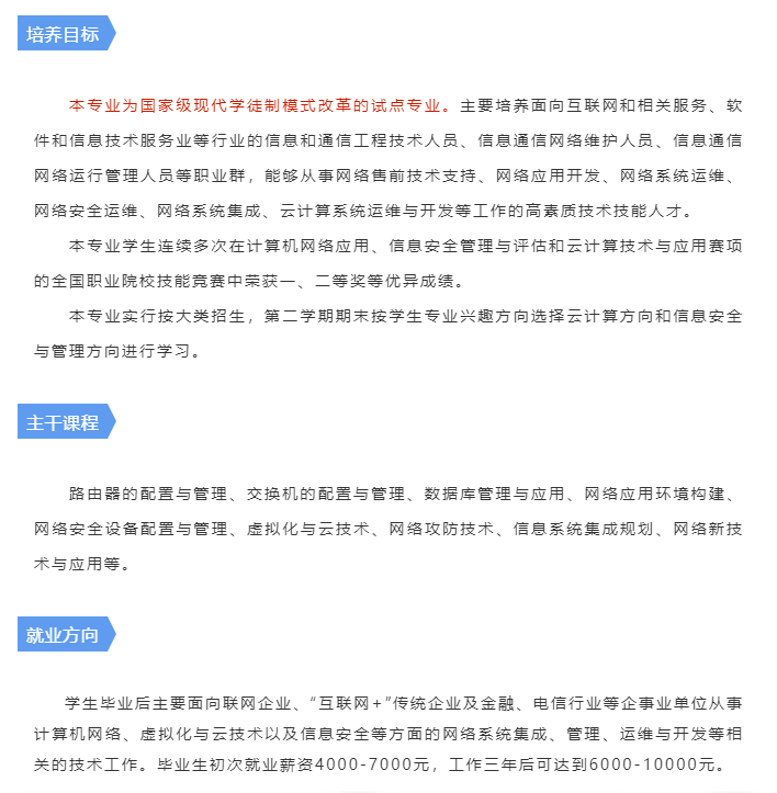 学院已与思科、星网锐捷、网龙等IT知名企业建立校企战略合作,通过获得国际职业技能证书,提高学生的学习兴趣,提升其专业技能和就业竞争力。毕业生就业竞争力、就业率、薪资水平和就业稳定度均居省内院校前列。