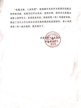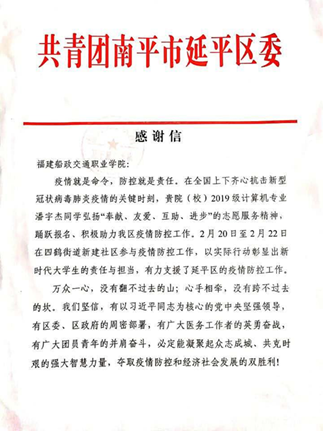 近期,信息工程系收到一封来自共青团南平市延平区委的感谢信,来信主要是为了感谢我系19级软件技术专业学生潘宇杰同学。疫情期间,潘宇杰同学积极报名参加社区防疫工作,有力支援了南平市延平区的疫情防控工作。信中共青团延平区委高度表扬了潘宇杰同学志愿参与疫情防控的无私奉献精神,同时也表达了祝我院越办越好,桃李满天下的美好祝愿。