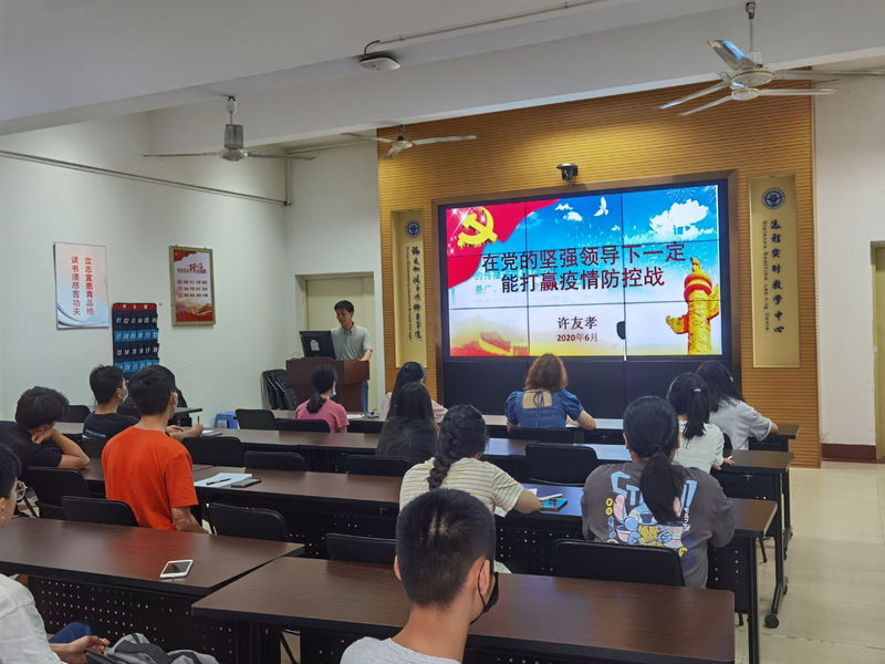 为了深入学习贯彻习近平新时代中国特色社会主义思想特别是习近平总书记最新重要讲话精神,深入贯彻落实党的十九大和十九届二中、三中、四中全会精神,强化制度自信教育,用好中国抗疫这本深刻、鲜活、生动的思政课教科书,教育引导学生充分认识中国共产党领导和中国特色社会主义制度的显著优势,增强“四个意识”、坚定“四个自信”、做到“两个维护”,传承和弘扬爱国主义精神,培养德智体美劳全面发展的社会主义建设者和接班人。2020年6月23日在2号楼2-1教室,信息工程系党总支书记许友孝书记、信息工程系主任黄金凤分别为2018级部份学生及预备党员、入党积极分子做了题为“在党中央坚强领导下坚决打赢疫情防控阻击战”和“疫情犹在,防控铭记”的形势与政策报告。