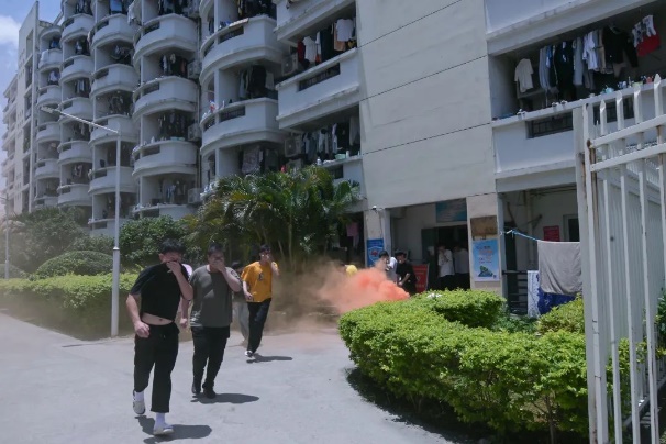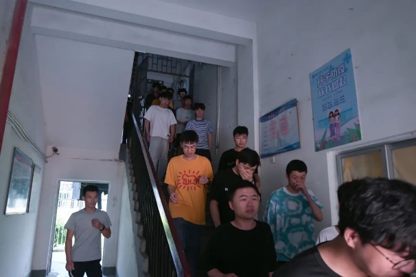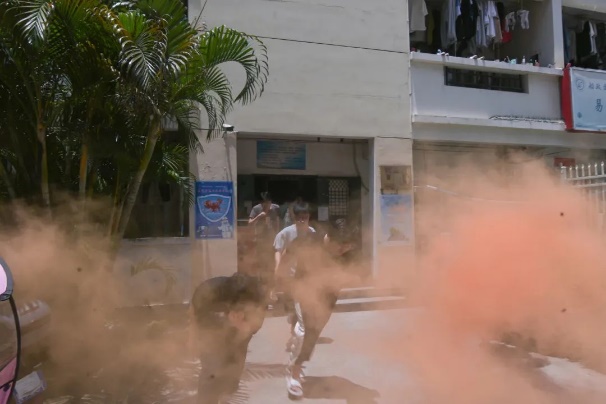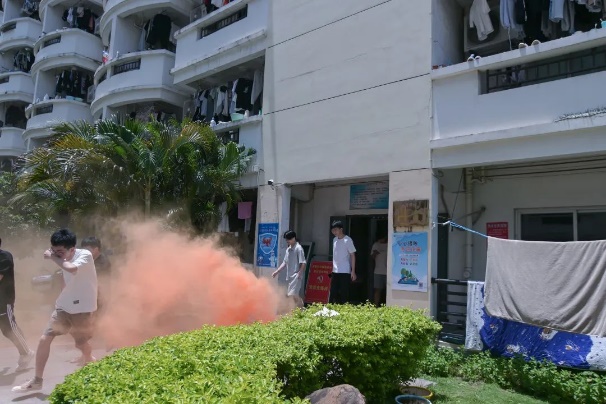 随着工作人员拉响警报、向各宿舍楼投放烟雾弹,同学们在工作人员的指挥下有序撤离到了安全地带。撤离到操场后,各班班委清点人数并上报,确保无一人遗漏。