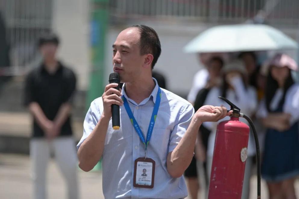 辅导员郑佳伟为同学们模拟火灾现场,并普及消防知识及逃生小常识,同时给同学们认真讲授干粉灭火器的使用方法和注意事项,总结出“一看、二摇、三拔、四握、五喷”灭火器使用五步法,随后组织现场人员有秩序地进行“灭火体验”。