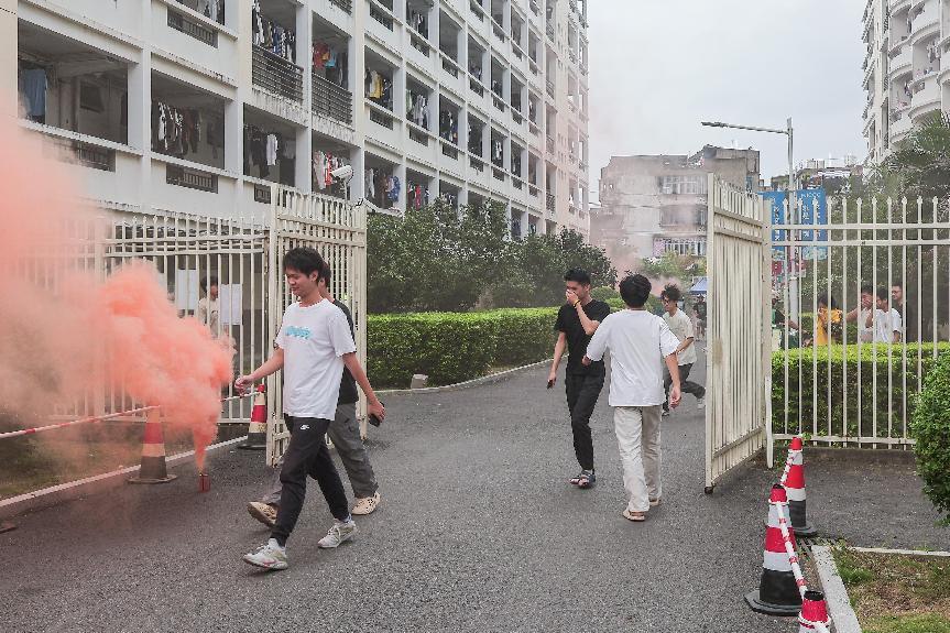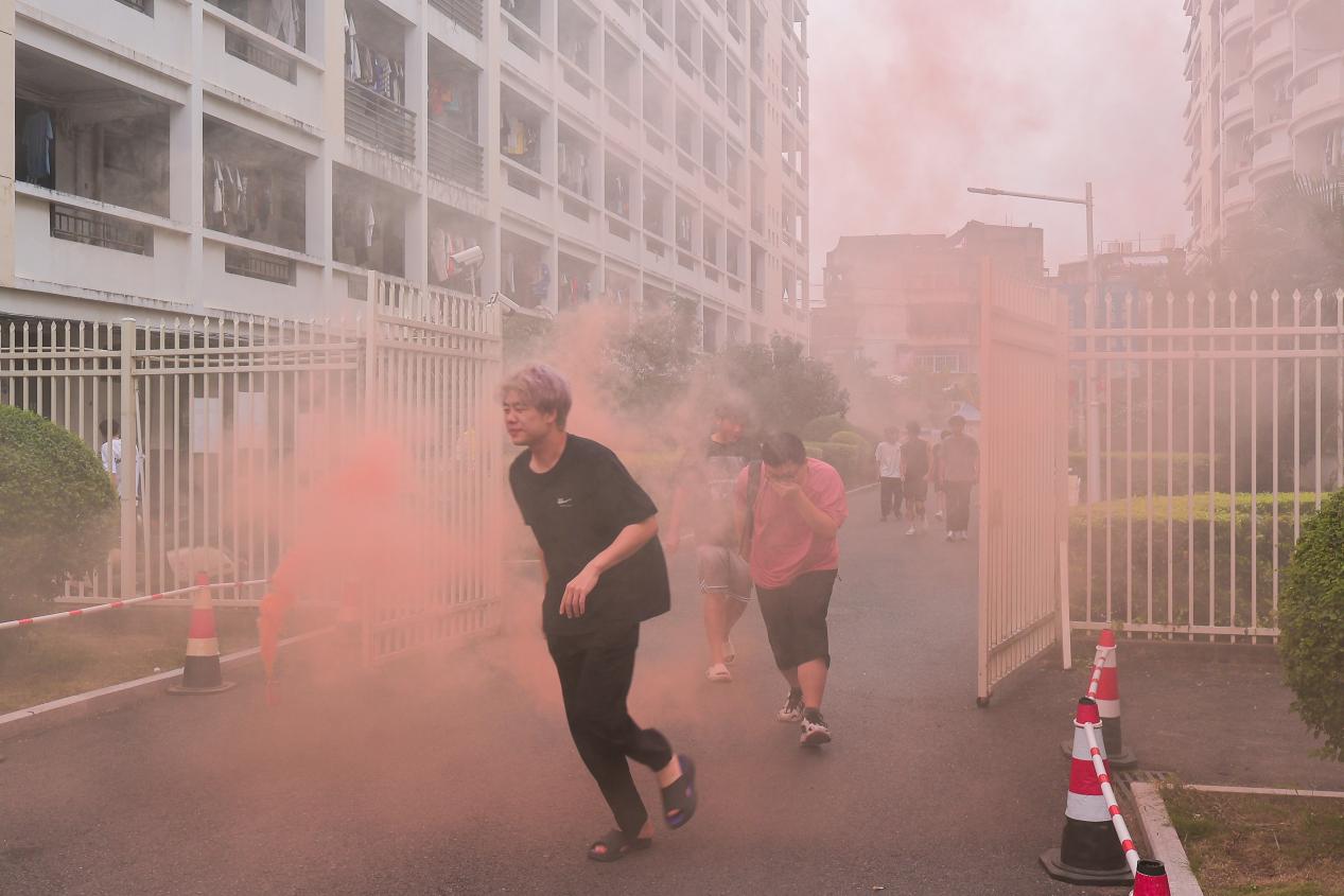 拉响警报、投放烟雾弹,同学们迅速有序地从教室和宿舍撤离到了24号楼旁篮球场。