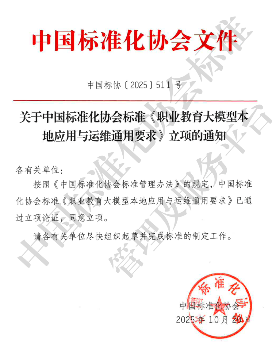 近日,由我院参与编制的团体标准《职业教育大模型本地应用与运维通用要求》已正式通过中国标准化协会立项,标志着我院在人工智能与职业教育深度融合方向的标准化工作取得重要阶段性成果。