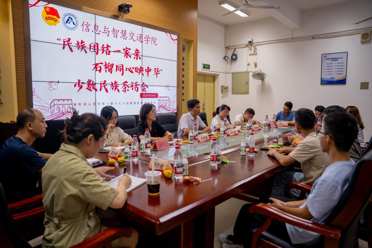 为深入贯彻落实党的民族政策,大力弘扬“各民族像石榴籽一样紧紧抱在一起”的民族团结精神,推动多民族交流融入日常教学与校园生活,信息与智慧交通学院于9月24日在福道园自强楼2-1会议室举办“民族团结一家亲,石榴同心映中华”少数民族茶话会。