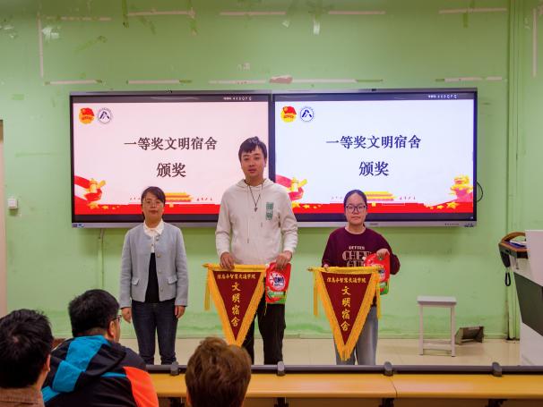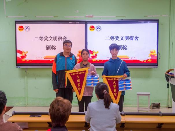 本次活动自10月中旬启动,全院在校同学积极参与,综合宿舍文化、遵规守纪、卫生状况等方面择优评选出15间学院”文明宿舍”。仪式上,主持人介绍了本次活动的目的和意义,宣读了获奖宿舍名单。柳燕妮副书记和参会辅导员老师们为获奖宿舍颁奖。